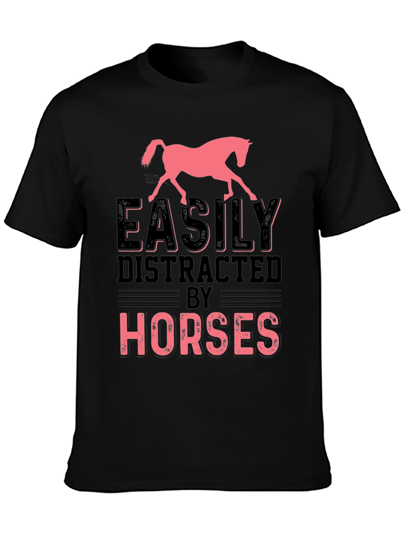 Show off your love for horses with this stylish black t-shirt. The design features a pink horse silhouette above the phrase "EASILY DISTRACTED BY HORSES." Perfect for casual wear, this tee is a great way to express your passion for equestrian activities. It's made from a comfortable fabric, ensuring a soft feel against your skin. Whether you're at the barn, running errands, or just relaxing at home, this t-shirt is a must-have for any horse enthusiast. Get yours today!
