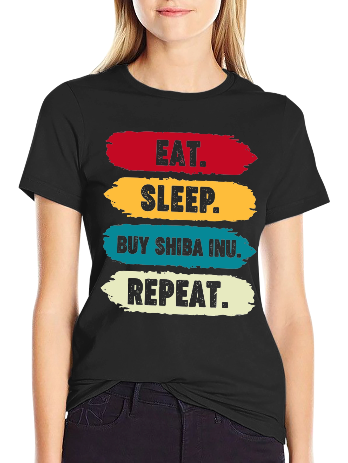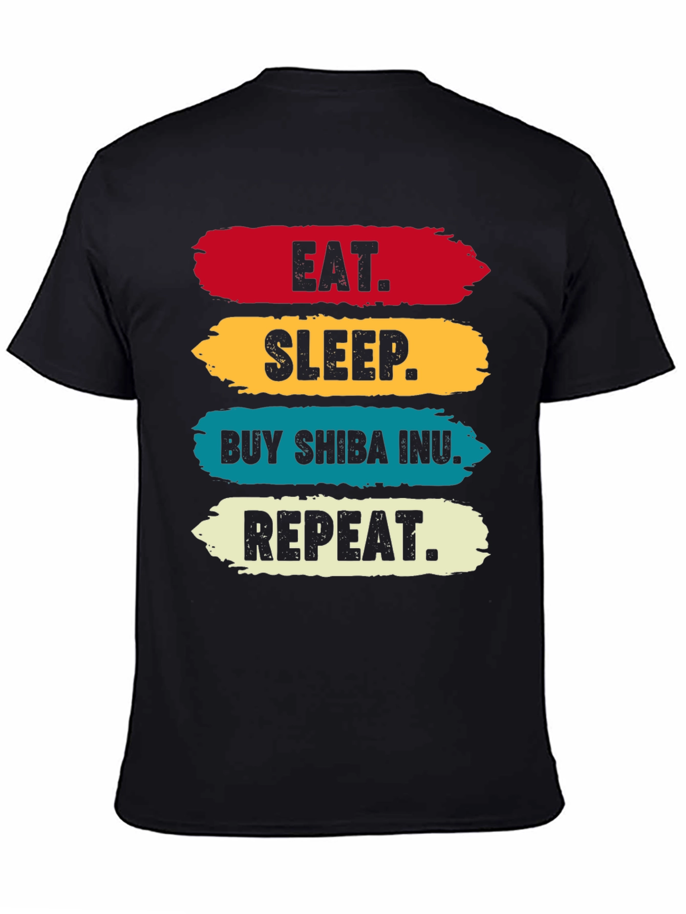 Show your love for Shiba Inu with this eye-catching t-shirt! This black tee features a bold and colorful design with the words "EAT," "SLEEP," "BUY SHIBA INU," and "REPEAT" printed in a stacked format. Each word is set against a vibrant stripe of color – red, yellow, teal, and off-white respectively. Made from a soft, comfortable fabric, this shirt is perfect for casual wear, crypto meetups, or simply lounging around while keeping up with your favorite coin. A great conversation starter for any crypto enthusiast and a must-have addition to your wardrobe!