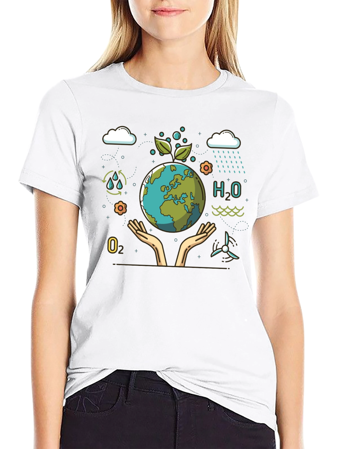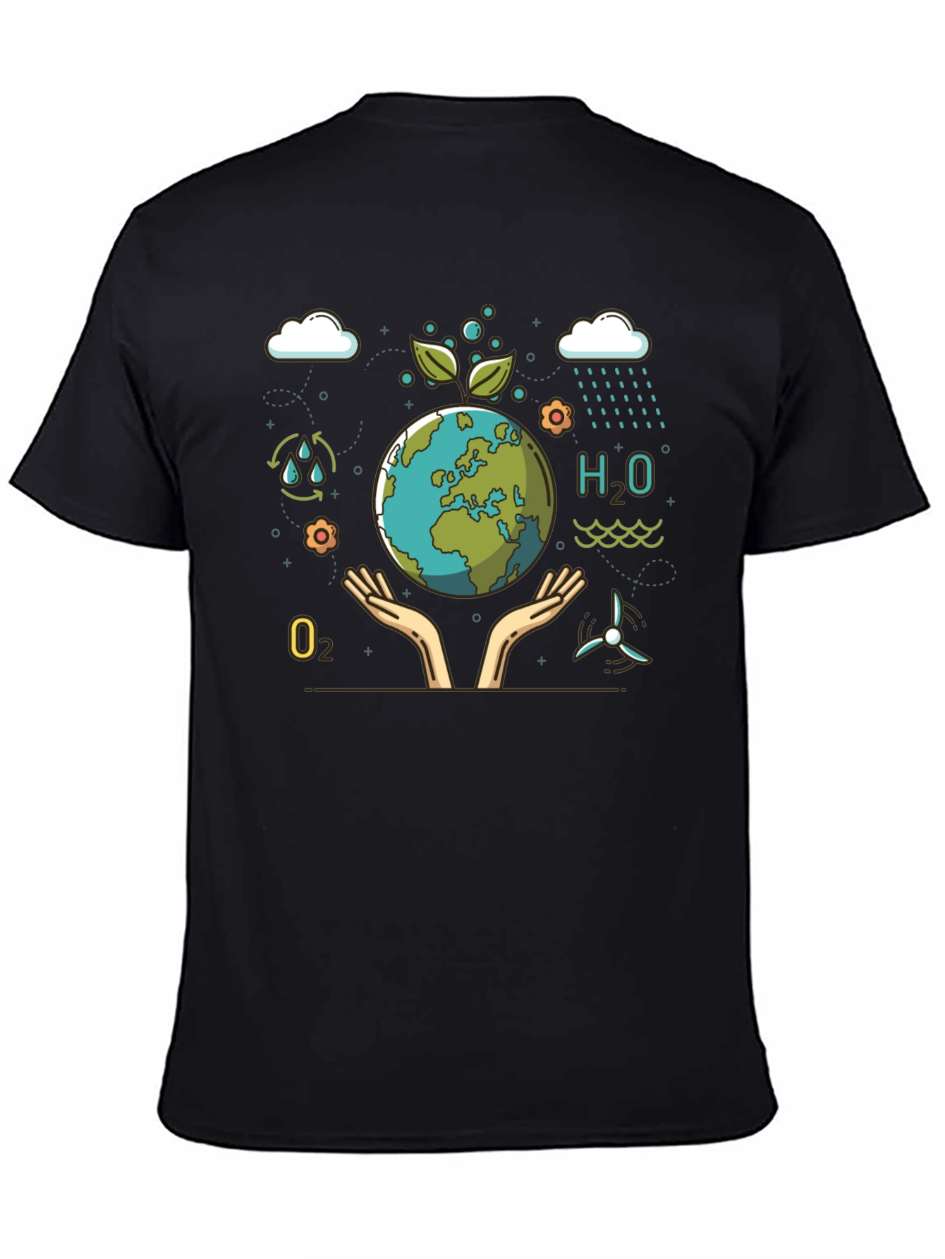 Show your love for the planet with this stylish black graphic t-shirt. Featuring a vibrant design of the earth being cradled by hands, surrounded by environmental elements like water droplets, wind turbines, and oxygen. This tee is perfect for eco-conscious individuals who want to make a statement. The bold graphic design ensures you'll stand out while promoting a sustainable lifestyle. Ideal for casual wear, environmental events, or everyday activism. Get yours today and wear your values!
