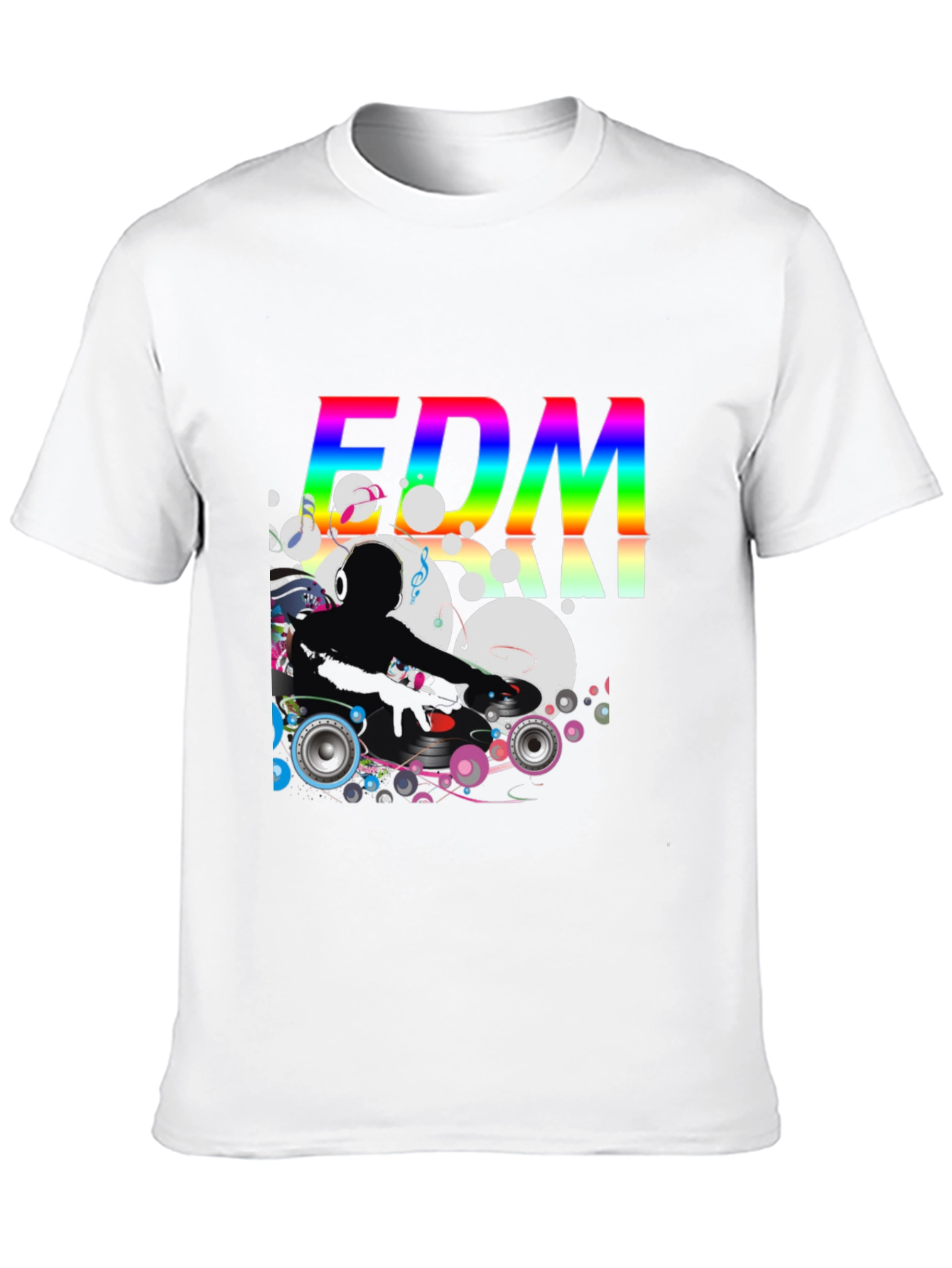 Rock your love for electronic dance music with this eye-catching black t-shirt. This comfortable tee features a vibrant graphic of a DJ silhouette surrounded by speakers and musical elements, overlaid with the text "EDM" in a rainbow gradient. Made from soft, breathable cotton, this shirt is perfect for everyday wear, music festivals, or showing off your passion for DJing. The bold design ensures you'll stand out in the crowd. Get ready to turn heads and express your unique style with this awesome DJ-themed tee. Perfect for raves, casual outings, or just chilling with friends.