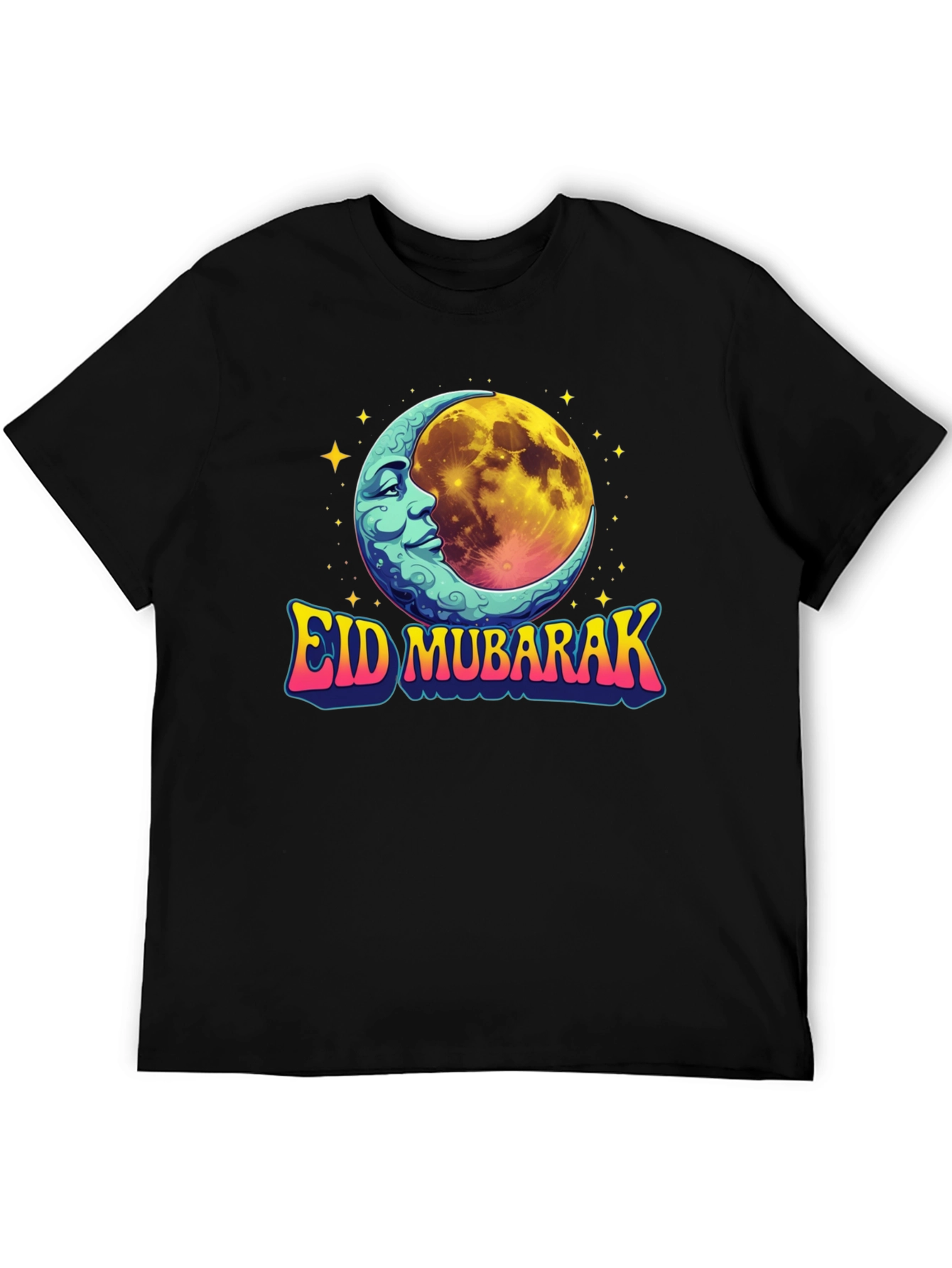Celebrate Eid in style with this unique black T-shirt. Featuring a vibrant graphic of a crescent moon with a face, set against a golden moon backdrop, and the words 'Eid Mubarak' in a retro font. The design is eye-catching and festive. Made from a comfortable, breathable fabric, this tee is perfect for Eid gatherings, family celebrations, or casual wear. Show your festive spirit with this statement piece. A cool and contemporary design for anyone wanting to celebrate this special occasion.