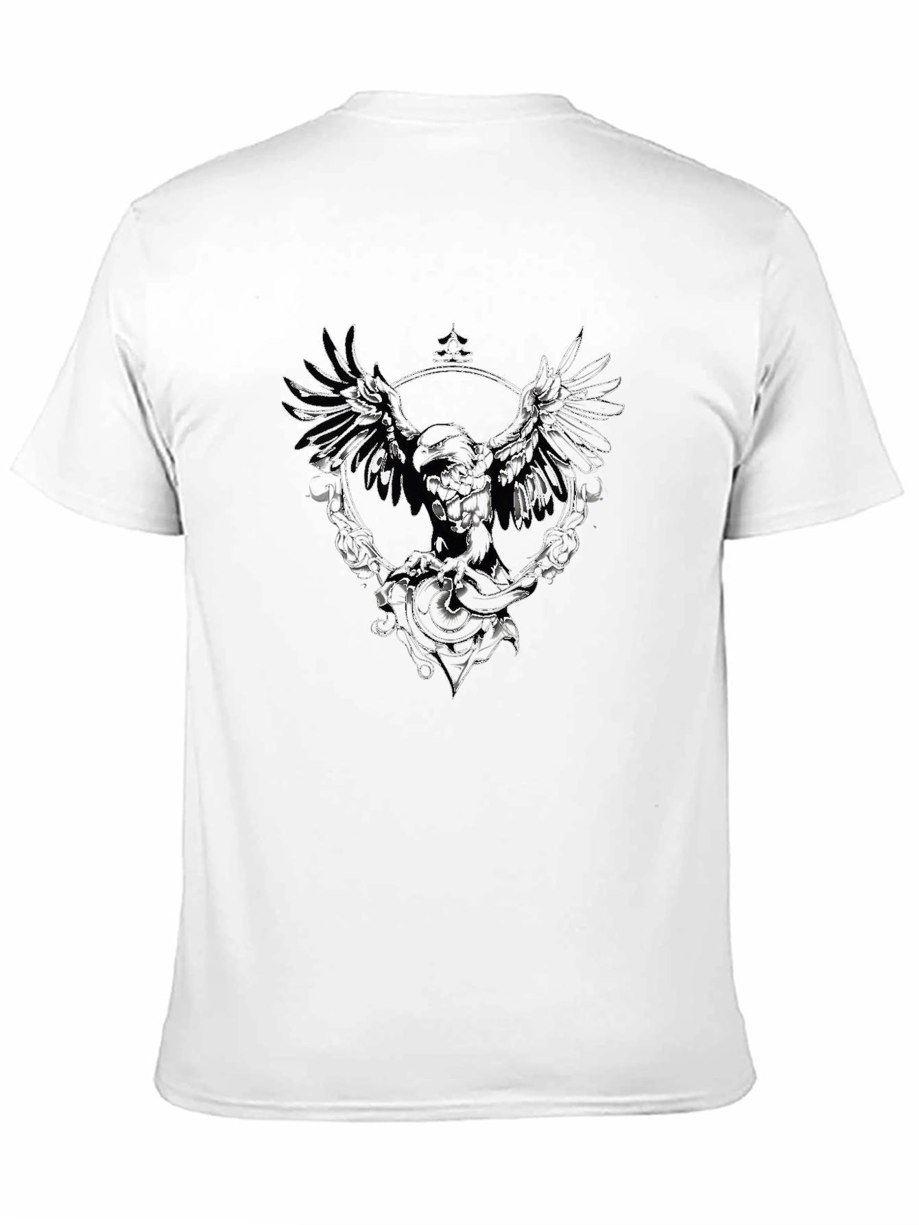 Make a bold statement with this striking black t-shirt. The shirt features a detailed emblem graphic at the center, giving off an edgy yet stylish vibe. The dark color makes the design pop, adding an eye-catching element to any outfit. Made from what appears to be comfortable material, this tee is ideal for casual outings, concerts, or just lounging around. The design is unique and allows you to express your individuality. Step up your wardrobe with this eye-catching, expressive piece that is sure to turn heads.