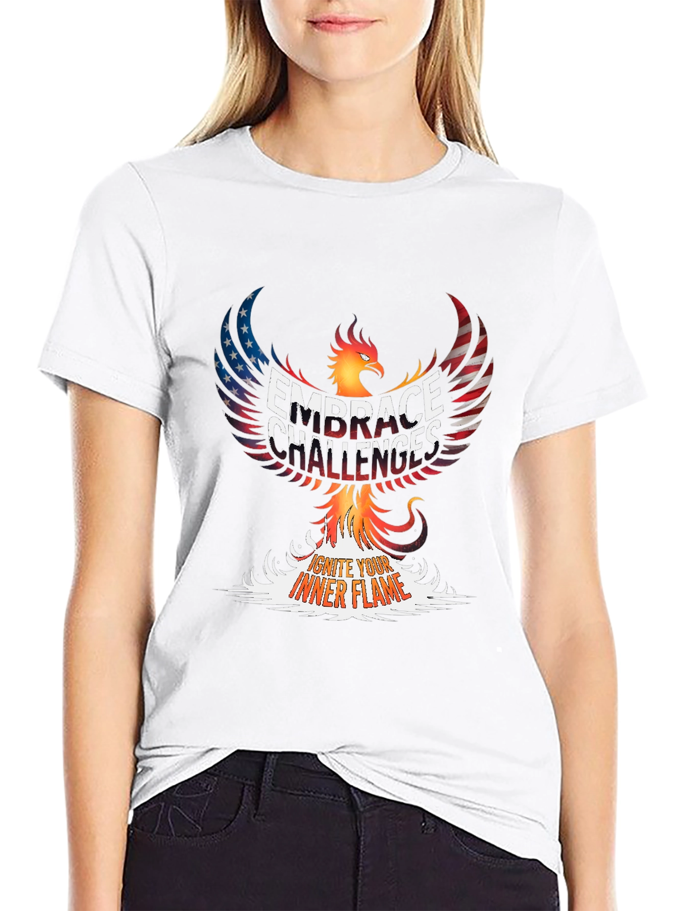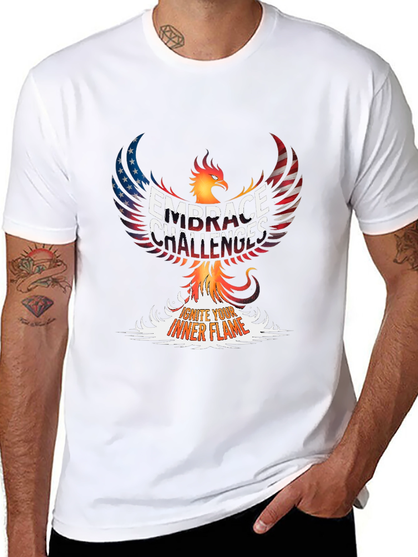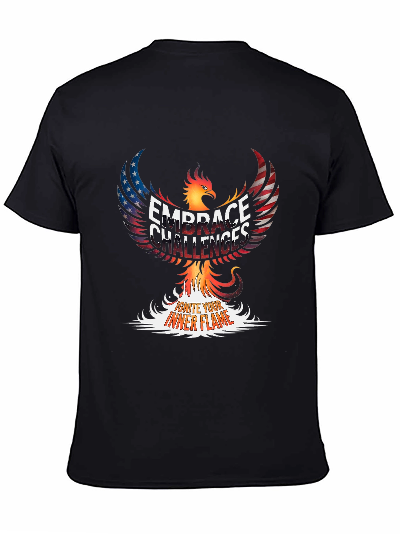 Ignite your inner strength with this powerful graphic tee. Featuring a striking phoenix design overlaid with the phrase "Embrace Challenges" and "Ignite Your Inner Flame," this shirt is a bold statement of resilience. The phoenix's wings are creatively rendered with an American flag pattern, blending patriotism with personal empowerment. Made from comfortable material, this classic tee is perfect for casual wear, workouts, or as a motivational reminder throughout your day. Wear it to the gym, on errands, or while tackling new goals. Let this unique tee inspire you to overcome obstacles and rise above any challenge!