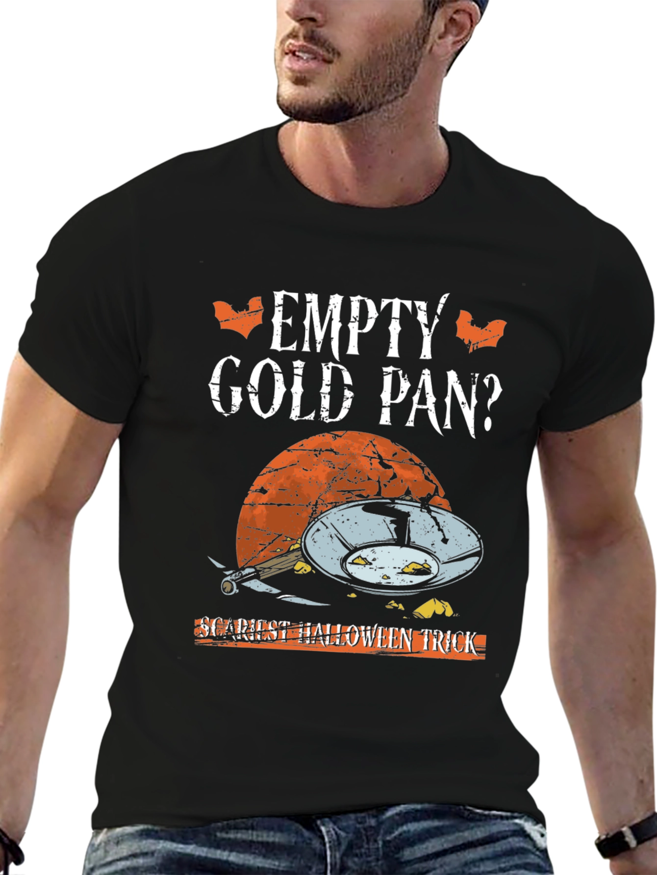 Get ready for Halloween with this unique graphic tee! Featuring the funny text "Empty Gold Pan? Scariest Halloween Trick", this shirt is sure to be a hit at any Halloween party. The design includes a graphic of a gold pan and rocks, set against a textured sunset backdrop. Made from comfortable, breathable fabric, this tee is perfect for casual wear or dressing up for a spooky occasion. Show off your sense of humor and celebrate Halloween in style with this eye-catching t-shirt. It's the perfect conversation starter for gold-panning enthusiasts and Halloween lovers alike!