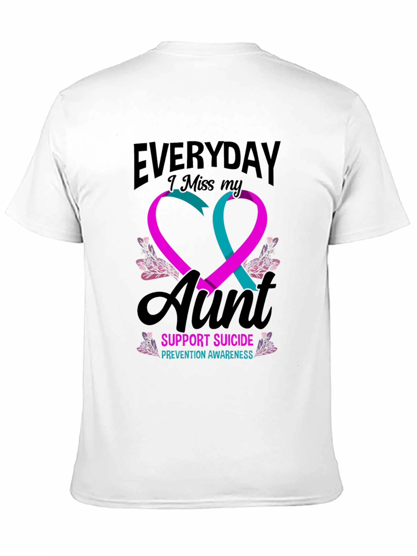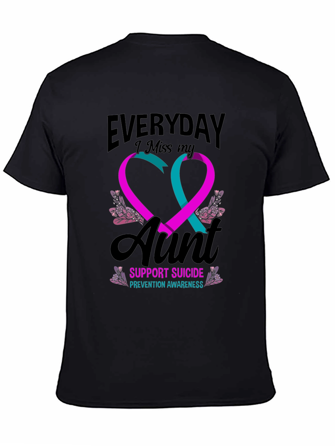 Show your support with this meaningful black t-shirt. The design features intertwined teal and purple ribbons forming a heart shape, surrounded by delicate floral accents. Above the heart, the text "EVERYDAY I Miss my" is printed, followed by "Aunt" and "SUPPORT SUICIDE PREVENTION AWARENESS" below the ribbon heart. Made from a soft, comfortable fabric, this tee is perfect for raising awareness and honoring loved ones. Wear it to support a cause close to your heart and spread a message of hope and remembrance.