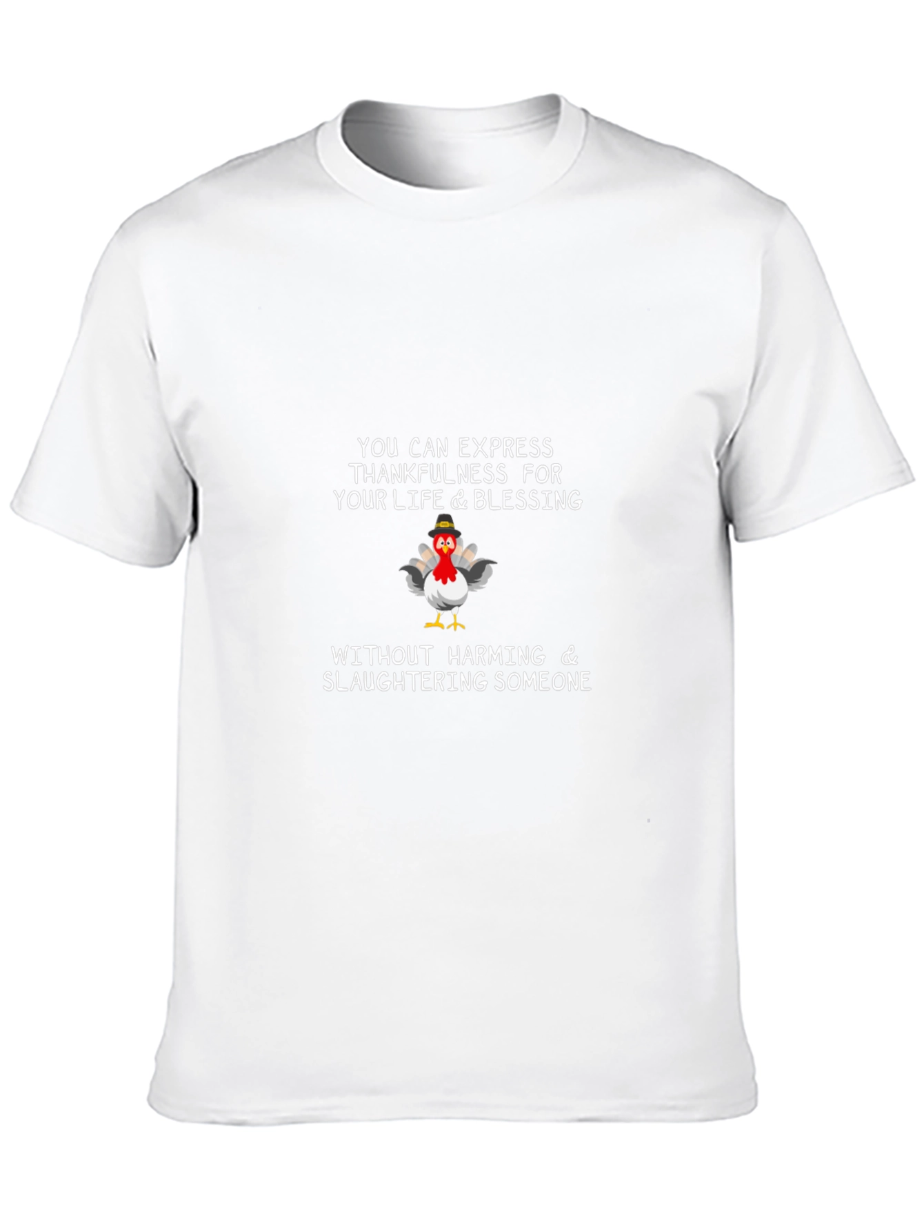 Spread Thanksgiving cheer with this unique black t-shirt! Featuring a playful cartoon turkey wearing a hat, accompanied by the message "You can express thankfulness for your life & blessing without harming & slaughtering someone." This comfortable tee is perfect for those who want to celebrate the holiday with a touch of humor and kindness. Made from a soft, breathable fabric, it ensures all-day comfort whether you're at a family gathering, casual outing, or just lounging at home. The bold design makes it a great conversation starter and a fun way to express your values. Get yours today and celebrate Thanksgiving in style!