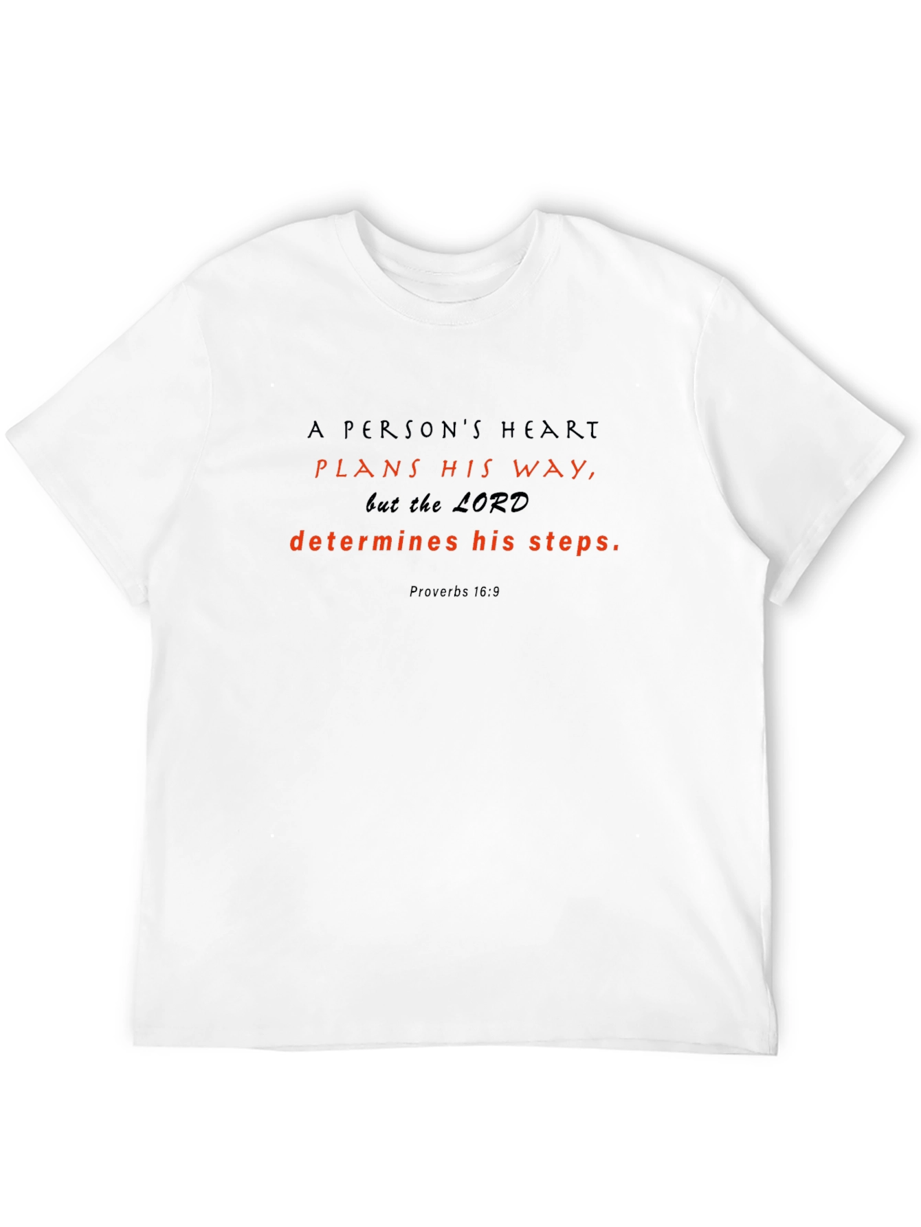 Display your faith with this classic black t-shirt. The design features the powerful message from Proverbs 16:9: "A person's heart plans his way, but the LORD determines his steps." The text is in red for a striking contrast against the black background. Made from comfortable, breathable fabric, this t-shirt is perfect for everyday wear, church events, or casual outings. Share your inspiration and faith with this elegant tee. It would also make a thoughtful gift for friends and family seeking a reminder of God's guidance.