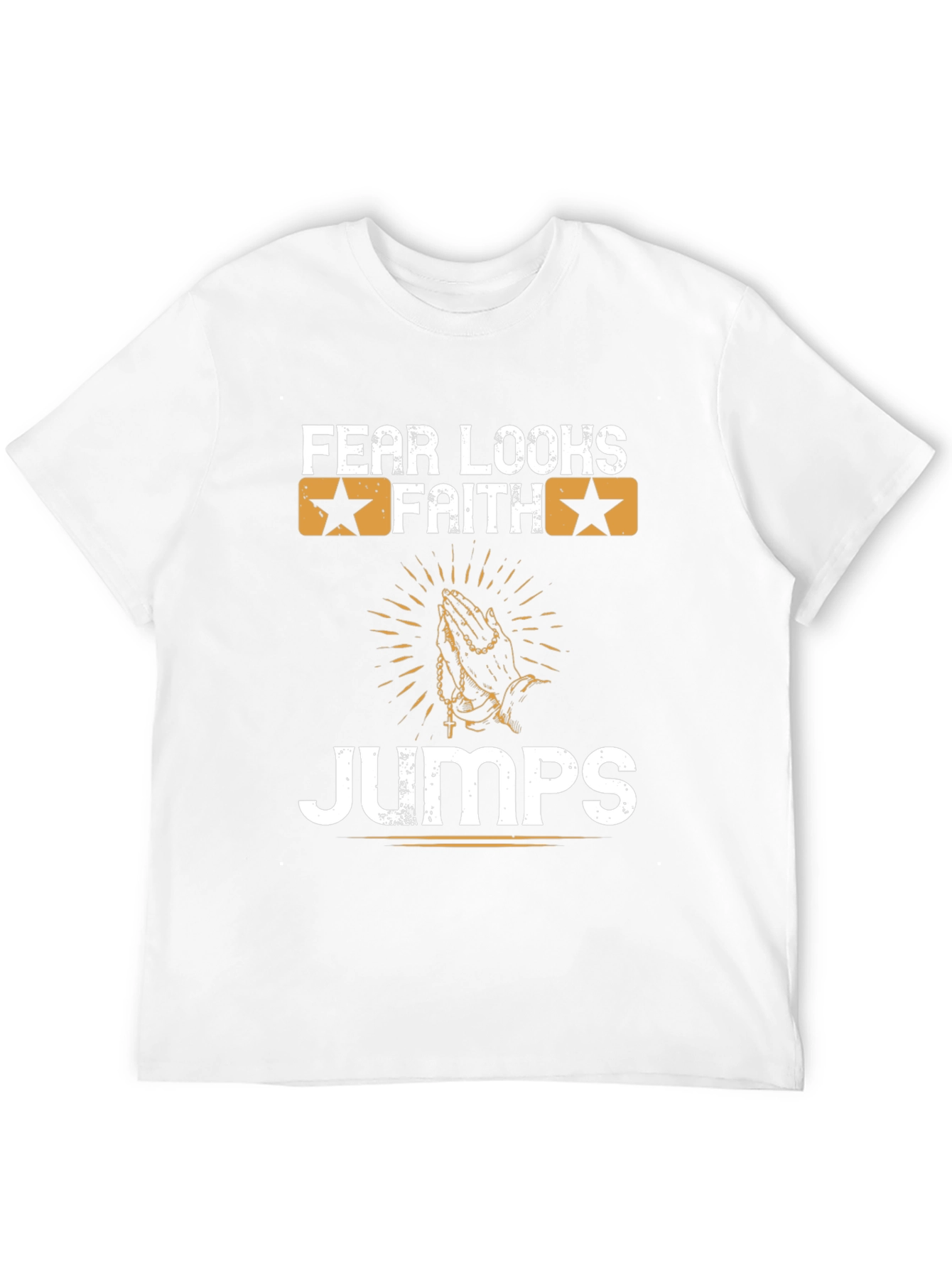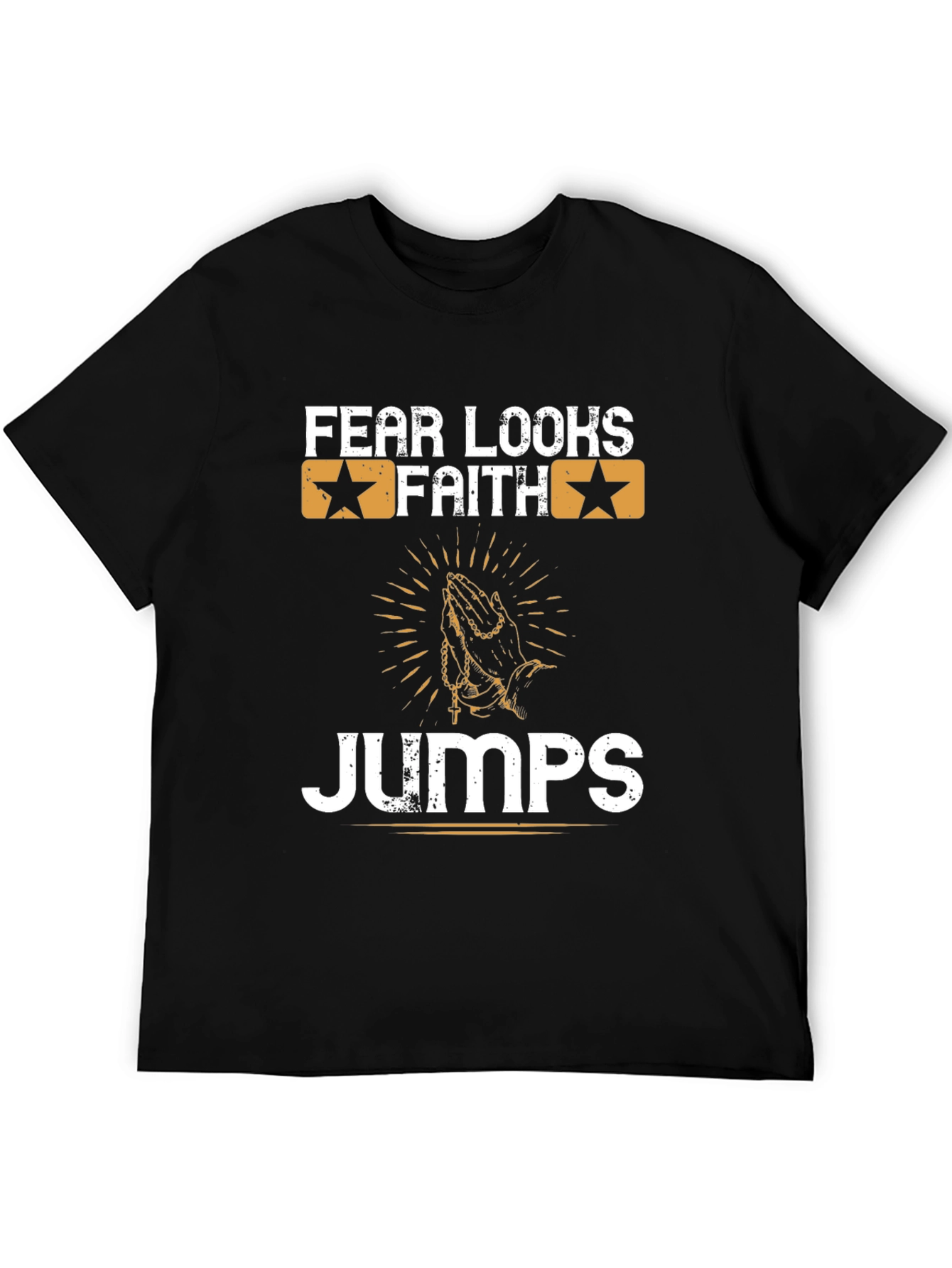 Embrace a bold statement with this striking graphic tee. Crafted from comfortable, breathable fabric, this t-shirt features the powerful message "Fear Looks, Faith Jumps", emblazoned in a distressed font. Accented with star graphics and an illustration of praying hands with a rosary, this tee blends style with meaningful symbolism. The classic black colorway ensures versatility, making it easy to pair with jeans, shorts, or joggers for a casual yet impactful look. Perfect for everyday wear, expressing your faith, or making a unique fashion statement, this tee is a must-have for those who dare to leap.