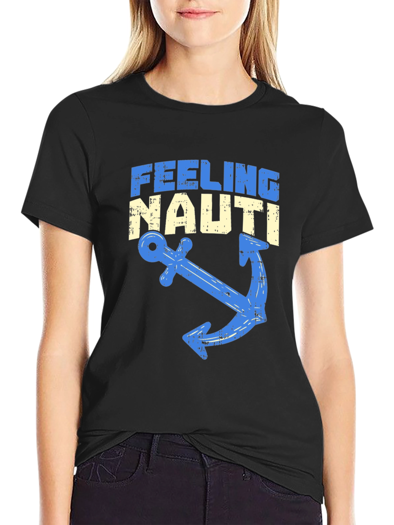 Show off your nautical side with this stylish men's black t-shirt. The design features the playful text "FEELING NAUTI" in a distressed, vintage-inspired font. Below the text is a blue anchor graphic that adds to the nautical theme. This classic fit tee is perfect for casual wear, beach days, or anyone who loves the sea. Made from comfortable materials, it will keep you feeling great all day long. A unique statement piece that's sure to be a conversation starter.