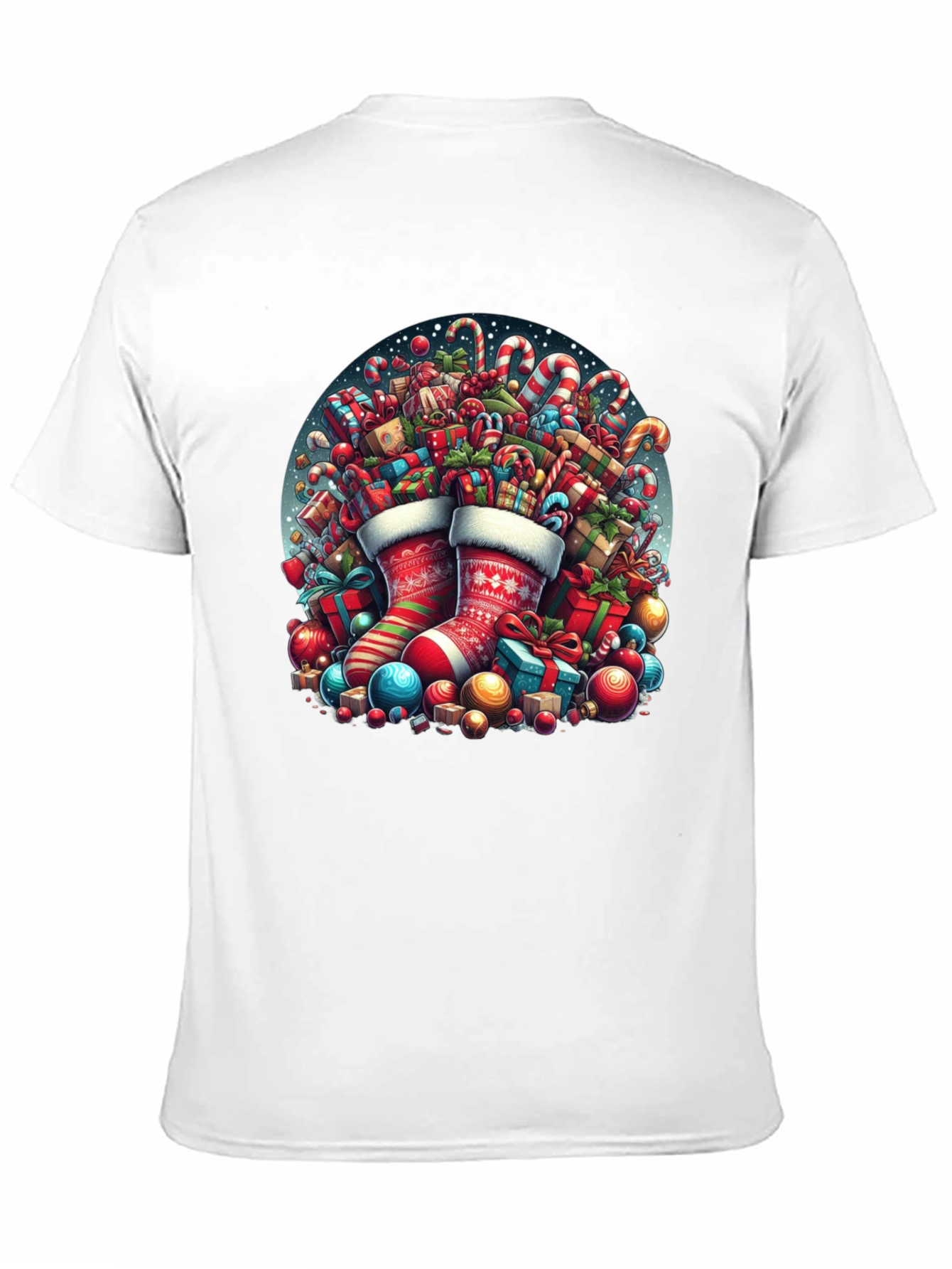 Spread holiday cheer with this eye-catching black t-shirt featuring a vibrant print of Christmas stockings overflowing with presents, candy canes, and ornaments. The intricate design captures the essence of the holiday season, making it a perfect conversation starter at any gathering. Made from comfortable materials, this tee offers both style and comfort. Ideal for Christmas parties, family gatherings, or as a fun, festive gift. Get yours today and celebrate the season in style!