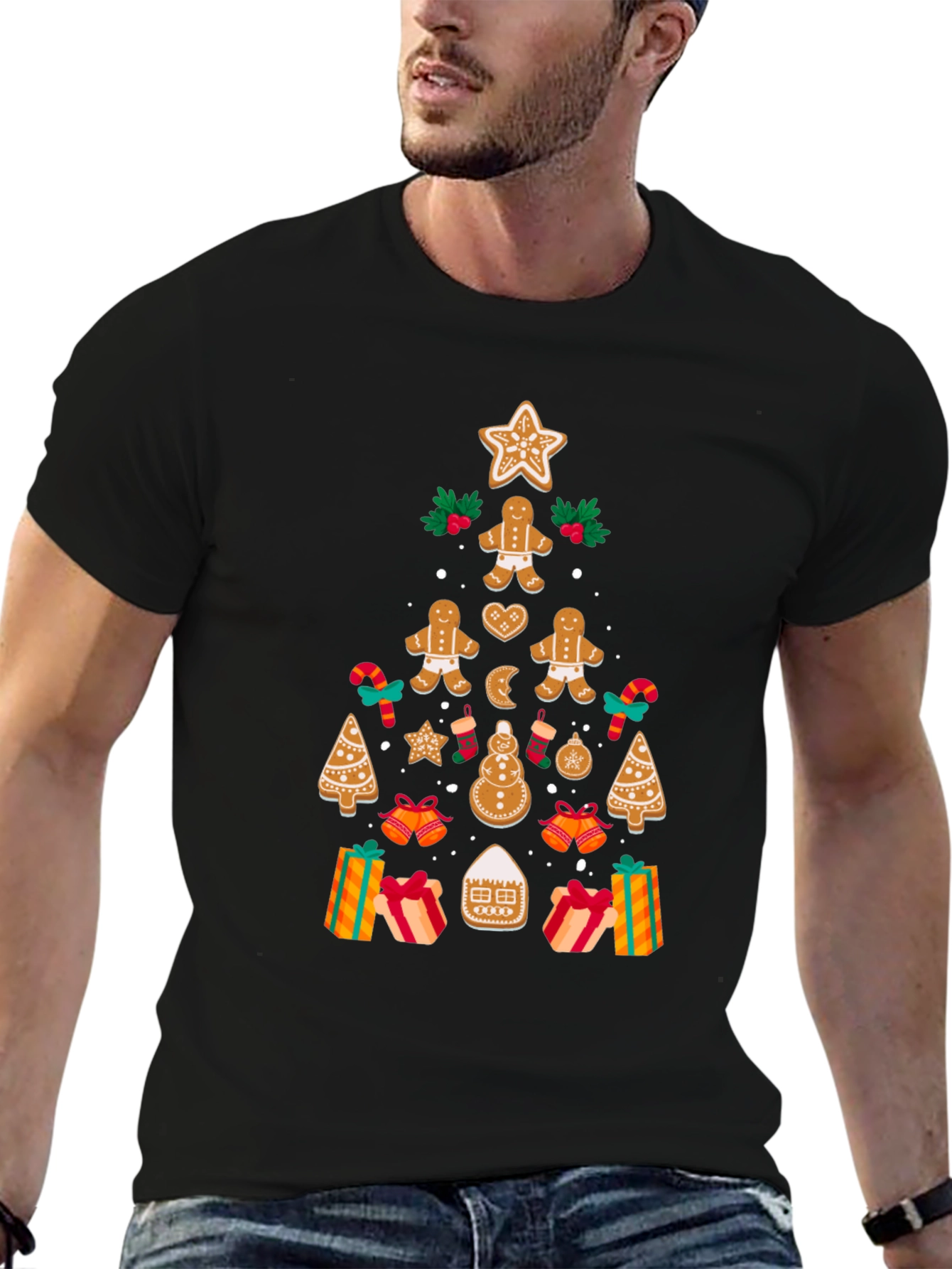 Spread holiday cheer with this unique black t-shirt featuring a whimsical gingerbread Christmas tree design. The tree is creatively constructed from various gingerbread shapes including gingerbread men, stars, trees, a crescent moon, a snowman, stockings, bells, a gingerbread house, candy canes, festive berries, and gift box graphics. This playful design makes it perfect for Christmas parties, family gatherings, or casual holiday outings. Made from a comfortable and breathable fabric, this shirt combines festive style with all-day comfort. A great way to showcase your holiday spirit, this t-shirt is sure to be a conversation starter. Get yours today and add a touch of sweetness to your wardrobe this holiday season!