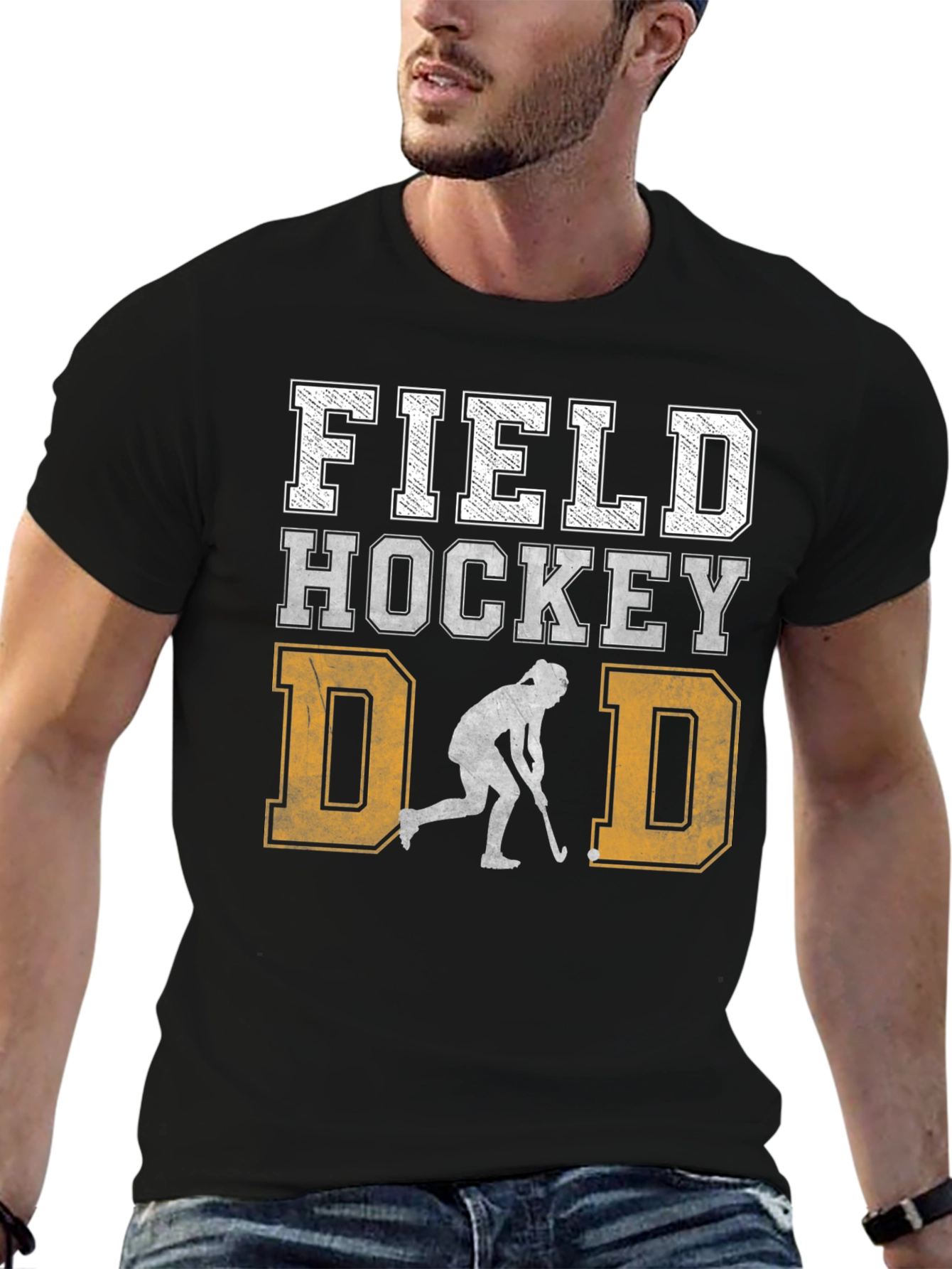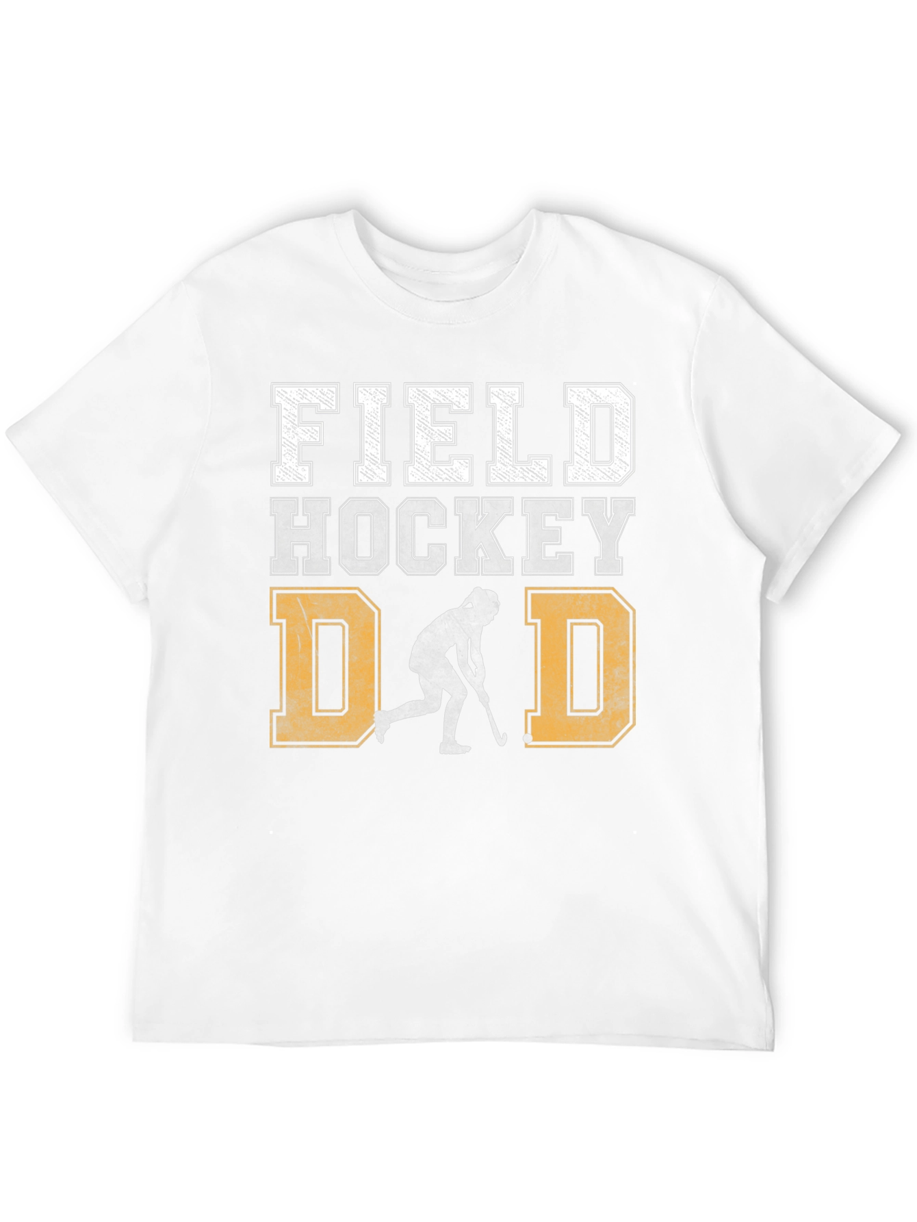 Show your support for your favorite field hockey player with this stylish and comfortable graphic t-shirt! The black tee features a distressed design with 'FIELD HOCKEY DAD' printed in bold lettering. A field hockey player silhouette is between the two 'D's. Made from a soft fabric, this shirt is perfect for wearing to games, practices, or just around town. A great gift for any proud field hockey dad!