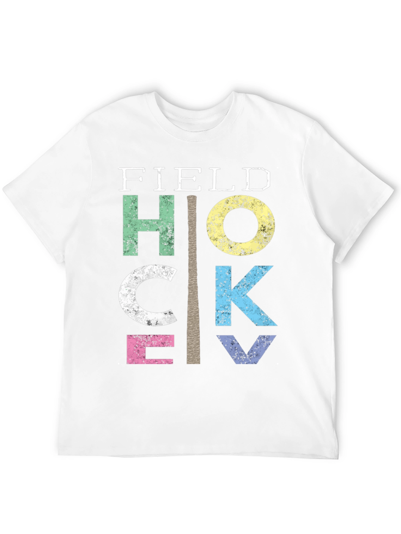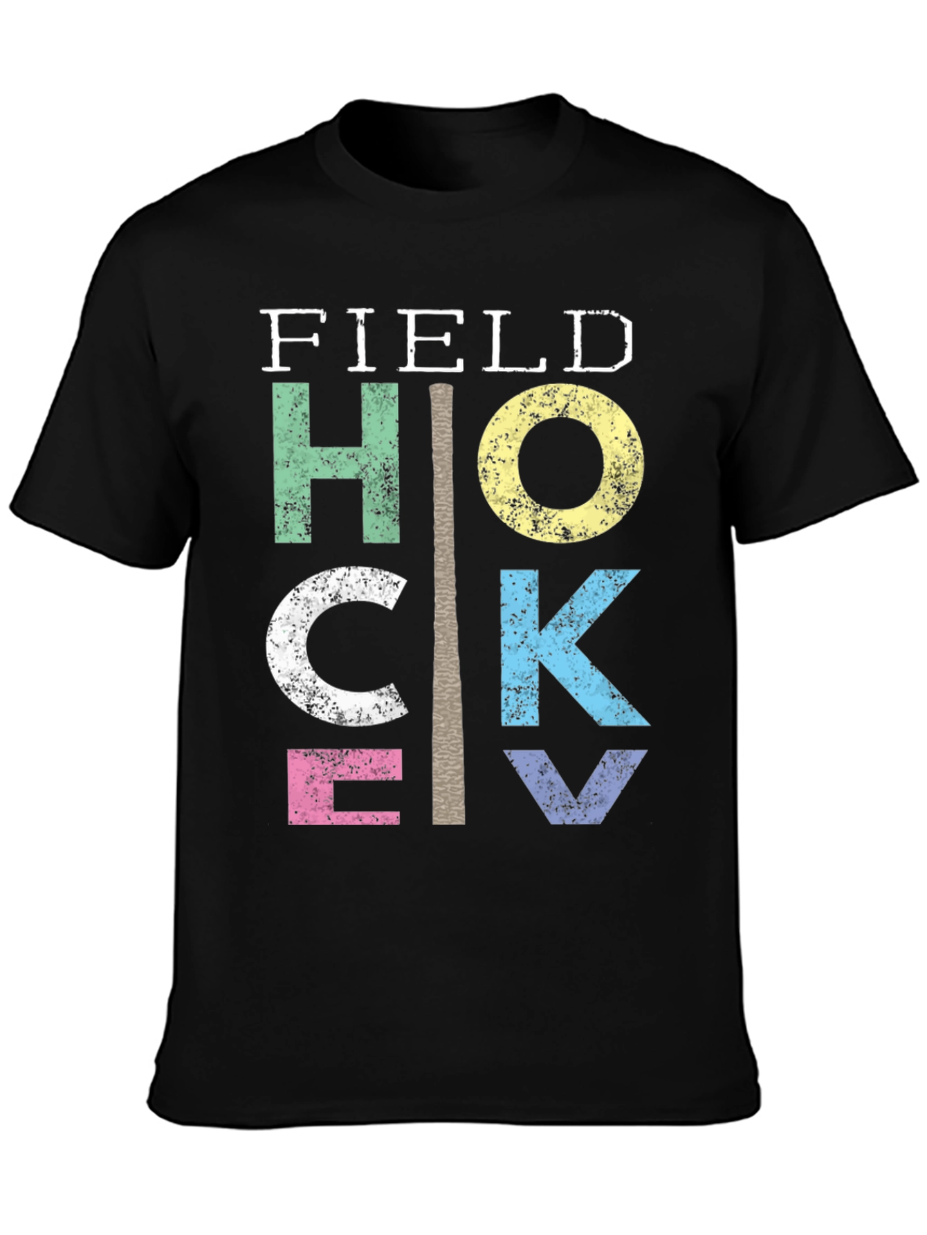 Show off your love for field hockey with this stylish graphic tee. This black t-shirt features the words "FIELD HOCKEY" in a vertical design, with each letter in a different pastel color, including light green, yellow, white, light blue and pink. A realistic hockey stick design serves as the "I" in Field and separates the first and second words. The unique design makes this shirt a standout piece in any wardrobe. Made from a comfortable fabric, this tee is perfect for casual wear, sports events, or showing team spirit. Get yours today and represent your favorite sport!