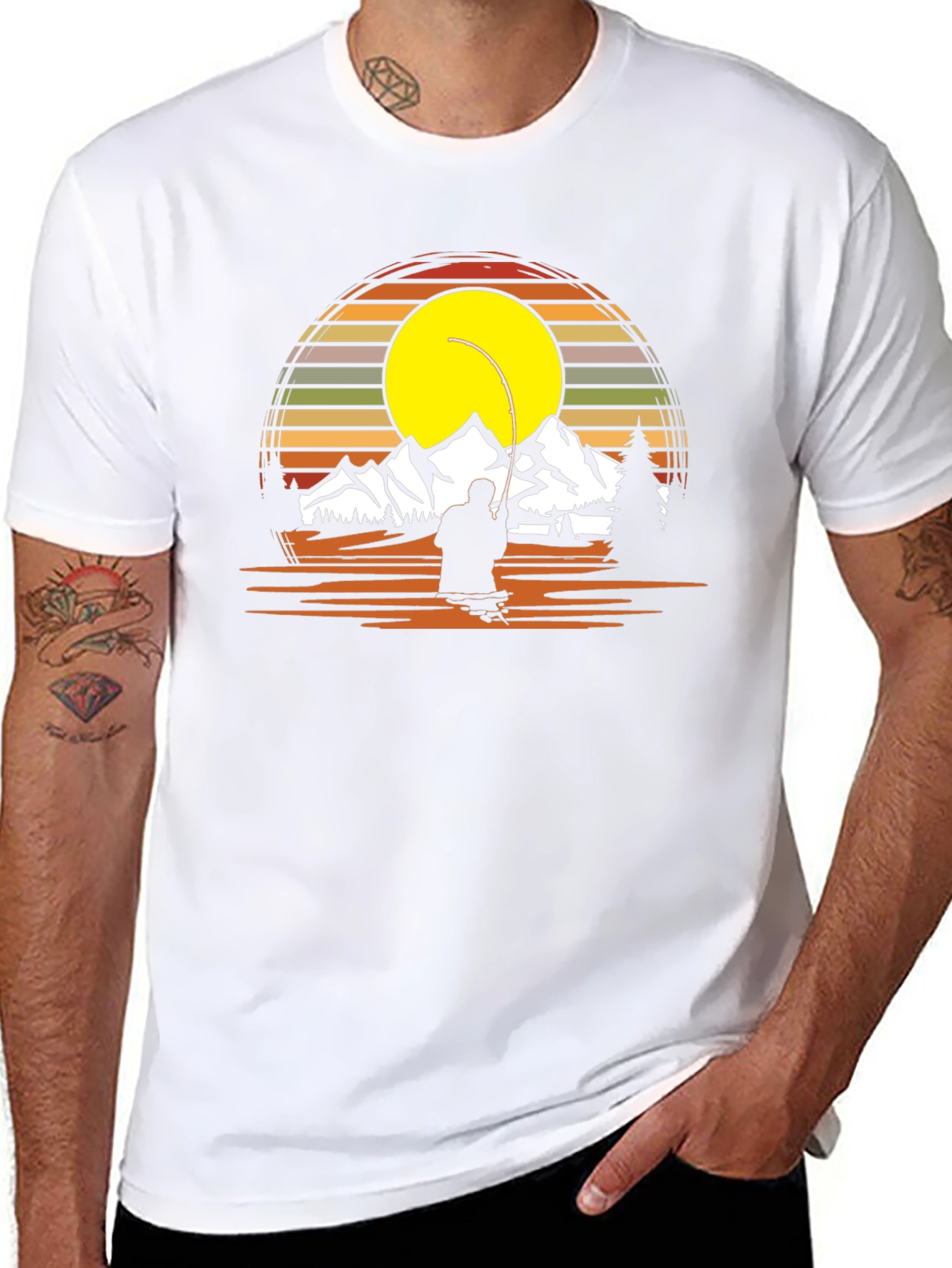 Embrace the outdoors with this eye-catching fishing t-shirt. The black tee features a striking retro graphic of a fisherman silhouetted against a mountain landscape at sunset. A large yellow sun dominates the backdrop, adding to the vintage aesthetic. Perfect for casual wear or as a gift for fishing enthusiasts, this shirt combines comfort and style with its unique design. The t-shirt seems lightweight and made of breathable fabric, ideal for outdoor activities or everyday wear. Stand out with this unique and fashionable piece that captures the spirit of adventure and the love for fishing.
