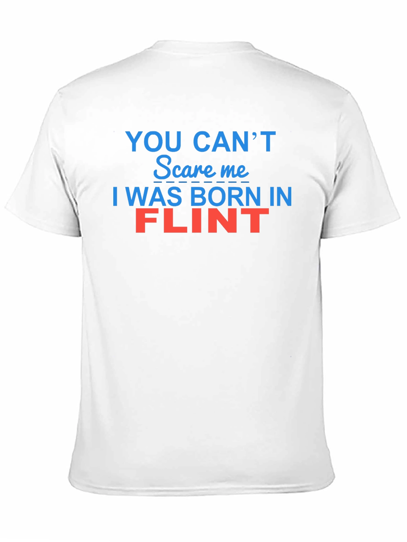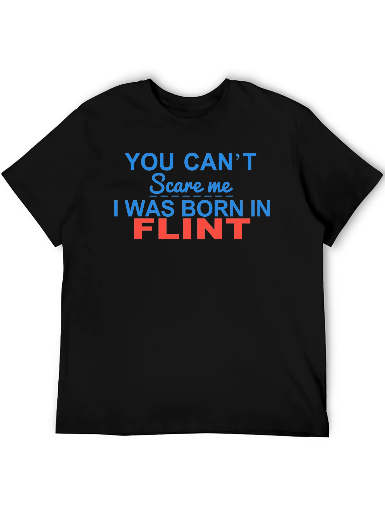Showcase your city pride with this bold black t-shirt! The design features the witty statement 'YOU CAN'T Scare me I WAS BORN IN FLINT', with 'YOU CAN'T Scare me' and 'I WAS BORN IN' displayed in a vivid blue and 'FLINT' in a striking red hue. Made from a comfortable-looking cotton blend, this tee is perfect for casual wear, local events, or as a fun gift for someone from Flint. Its classic fit ensures a relaxed feel, making it a great addition to any wardrobe. Let everyone know you're a proud Flint native with this eye-catching and humorous tee!