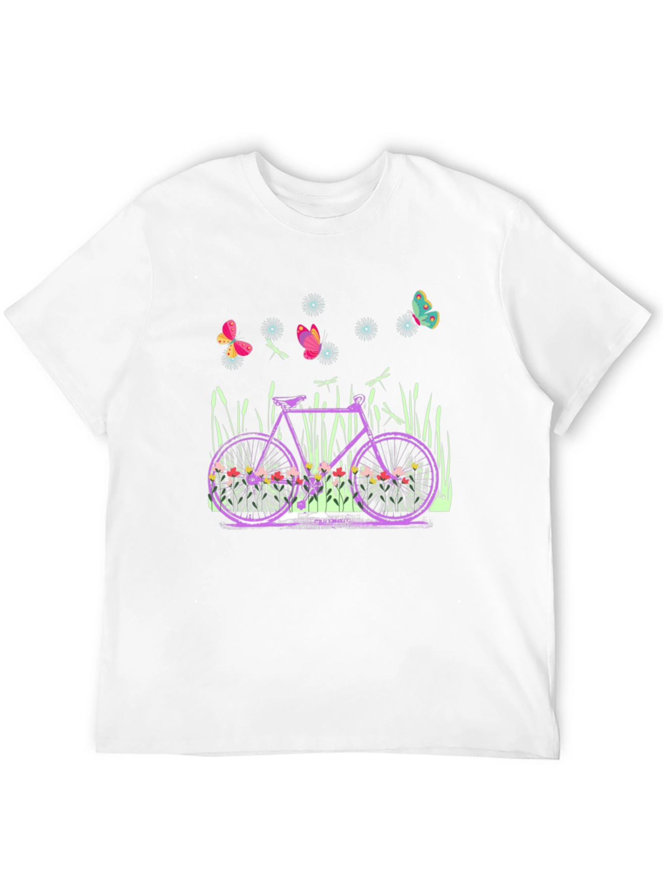 Embrace whimsical charm with this unique graphic tee! The black t-shirt features an eye-catching design of a vintage-style bicycle adorned with colorful flowers on its wheels. Butterflies and dragonflies flutter around the bike, set amidst tall grass, creating a scene of serene nature. The graphic is printed with high-quality inks for lasting vibrancy. Ideal for casual wear, outdoor adventures, or as a gift for the nature-loving cyclist in your life. Show off your free spirit and love for the outdoors with this stylish and comfortable tee.