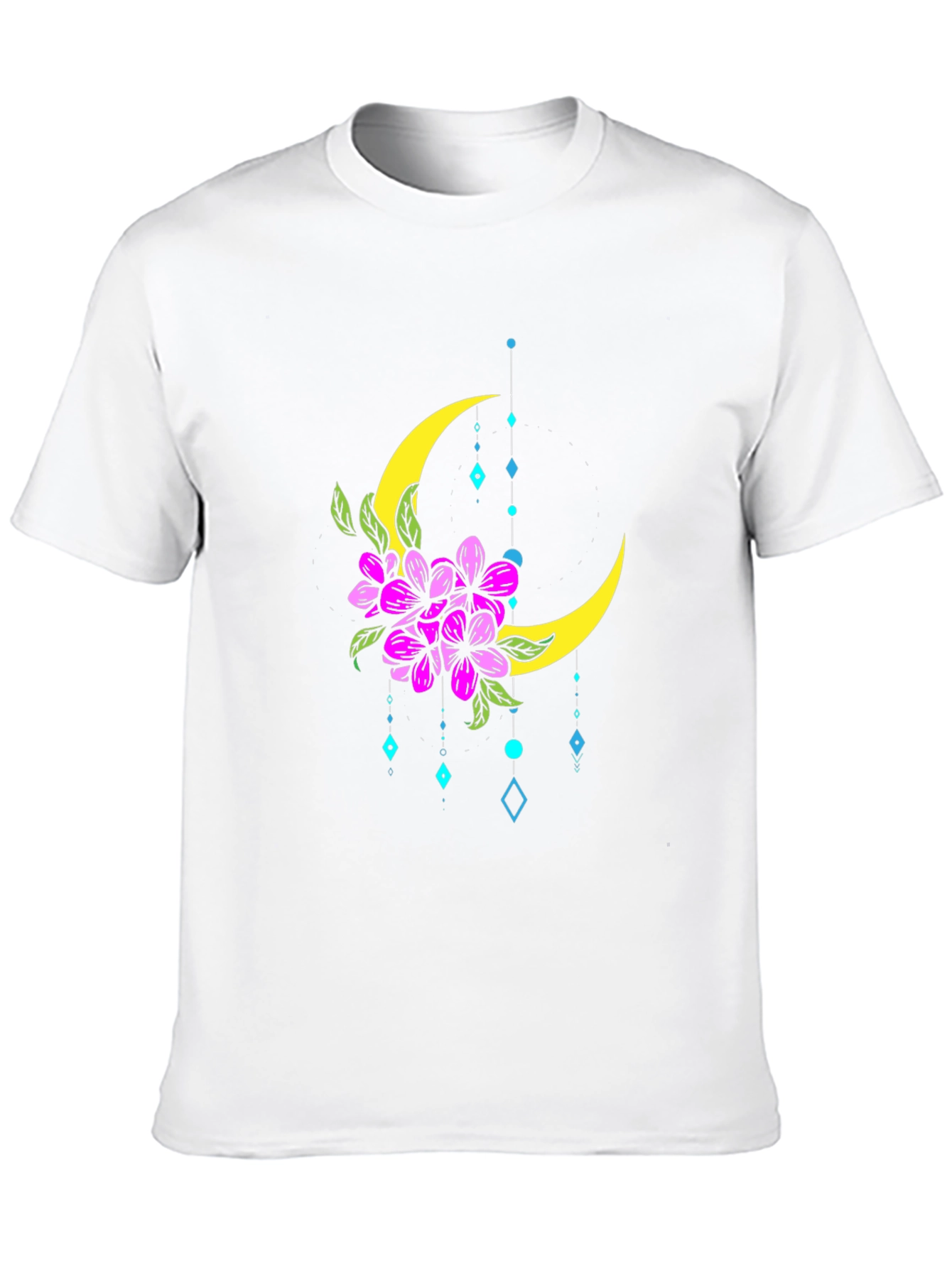 Embrace celestial style with this eye-catching black t-shirt featuring a unique floral moon graphic. The design showcases a vibrant crescent moon adorned with beautiful purple flowers and green leaves, complemented by delicate, dangling blue diamond accents. Crafted from a comfortable, breathable fabric, this tee offers a relaxed fit perfect for everyday wear. Ideal for casual outings, concerts, or simply lounging at home, this shirt adds a touch of bohemian flair to any outfit. The intricate design and bold color contrast make it a standout piece. Express your individuality and love for nature with this must-have addition to your wardrobe. Machine washable for easy care.