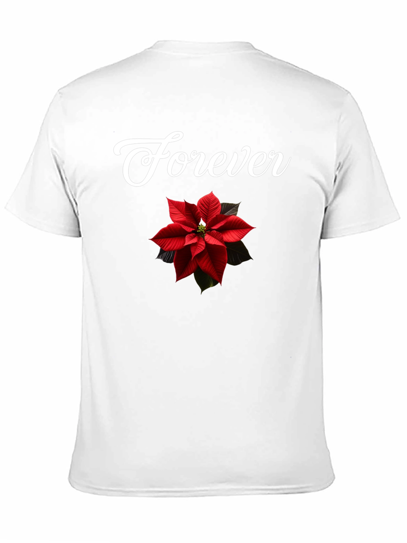 Showcase your love with this classic black t-shirt featuring a bright poinsettia graphic. The word "Forever" is written in white script above the flower. The shirt looks great on its own or layered under a jacket. Its simple design means it can be worn for casual occasions. This tee offers both comfort and style. Express yourself with this eye-catching t-shirt that will last for years to come.