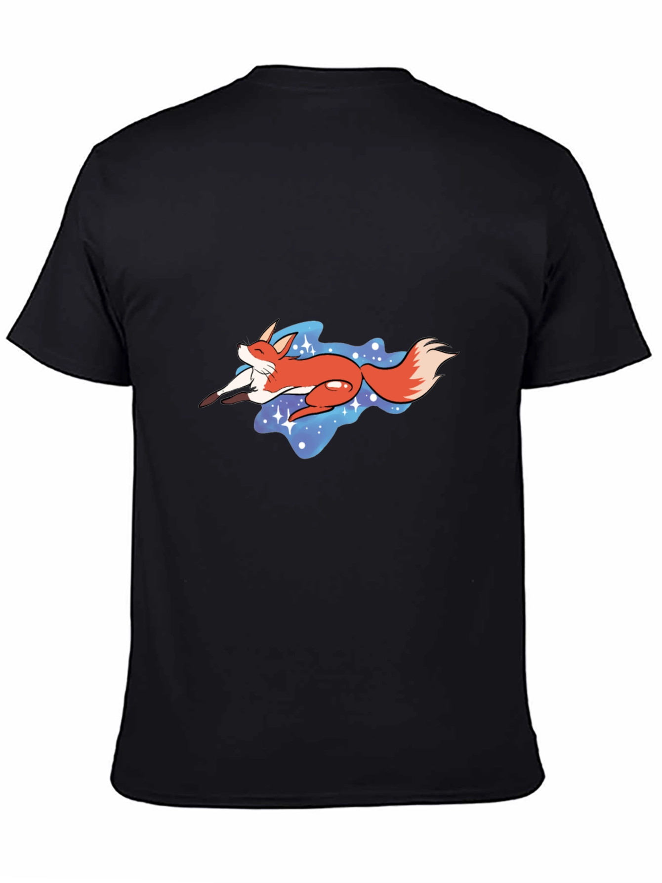 This black t-shirt features a whimsical graphic of a fox floating through a starry, light blue space design. The vibrant orange fox with its bushy white-tipped tail creates a fun, eye-catching contrast against the dark background. Made from a comfortable fabric, this unisex tee is perfect for casual wear. Ideal for expressing your unique style, this tee is a great conversation starter. Perfect for daily use or special occasions. Add a touch of fun to your wardrobe with this stylish and comfortable graphic t-shirt.
