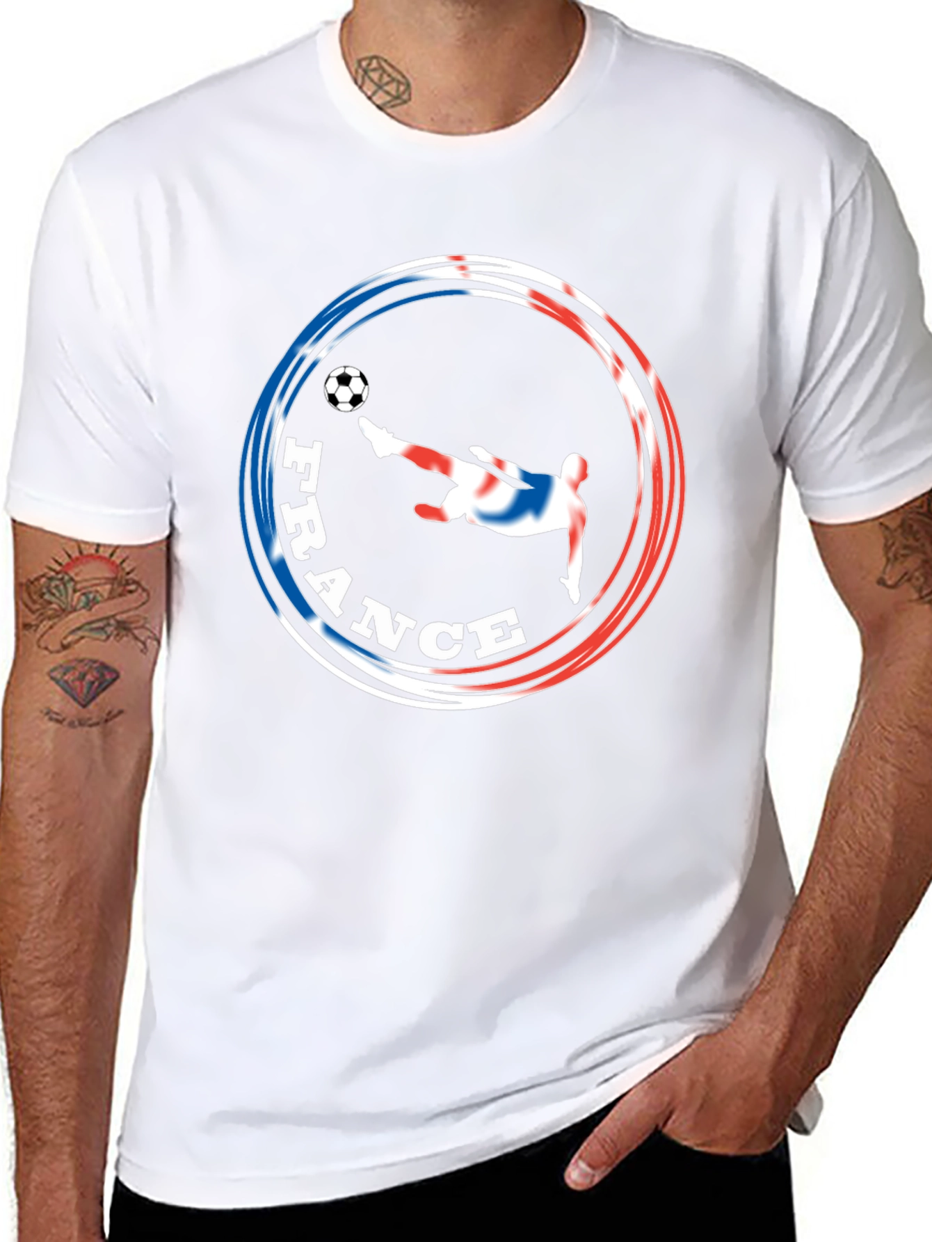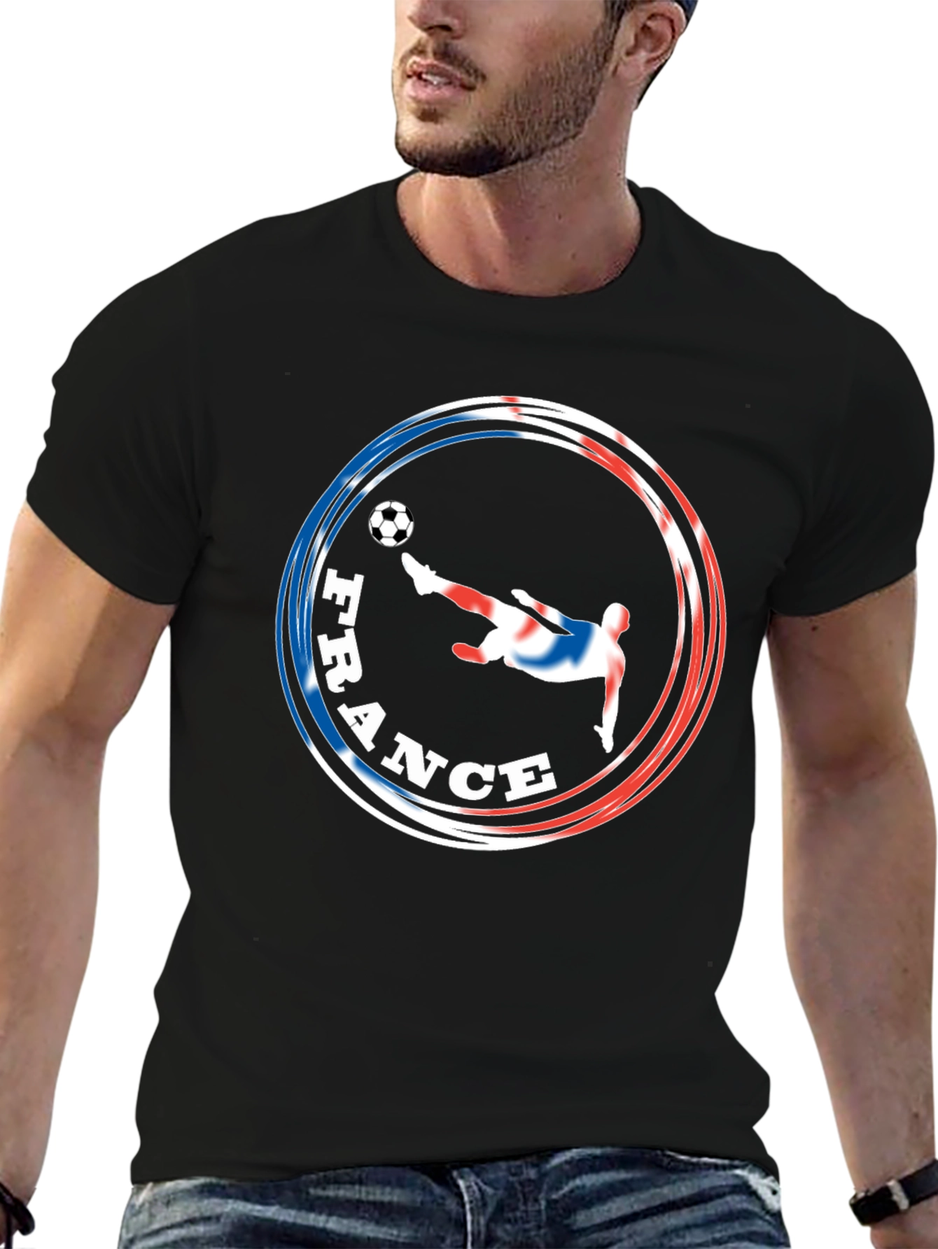 Show your support for the French national team with this unique soccer t-shirt. This eye-catching design features a silhouette of a player kicking a soccer ball, overlaid with the colors of the French flag, encircled by the word "FRANCE". Made from a comfortable black fabric, this t-shirt is perfect for casual wear, sports events, or showing your national pride. Its striking graphic is sure to make a statement, while the classic fit ensures a comfortable feel. Ideal for soccer fans, sports enthusiasts, or anyone who loves France. A must-have addition to any wardrobe!