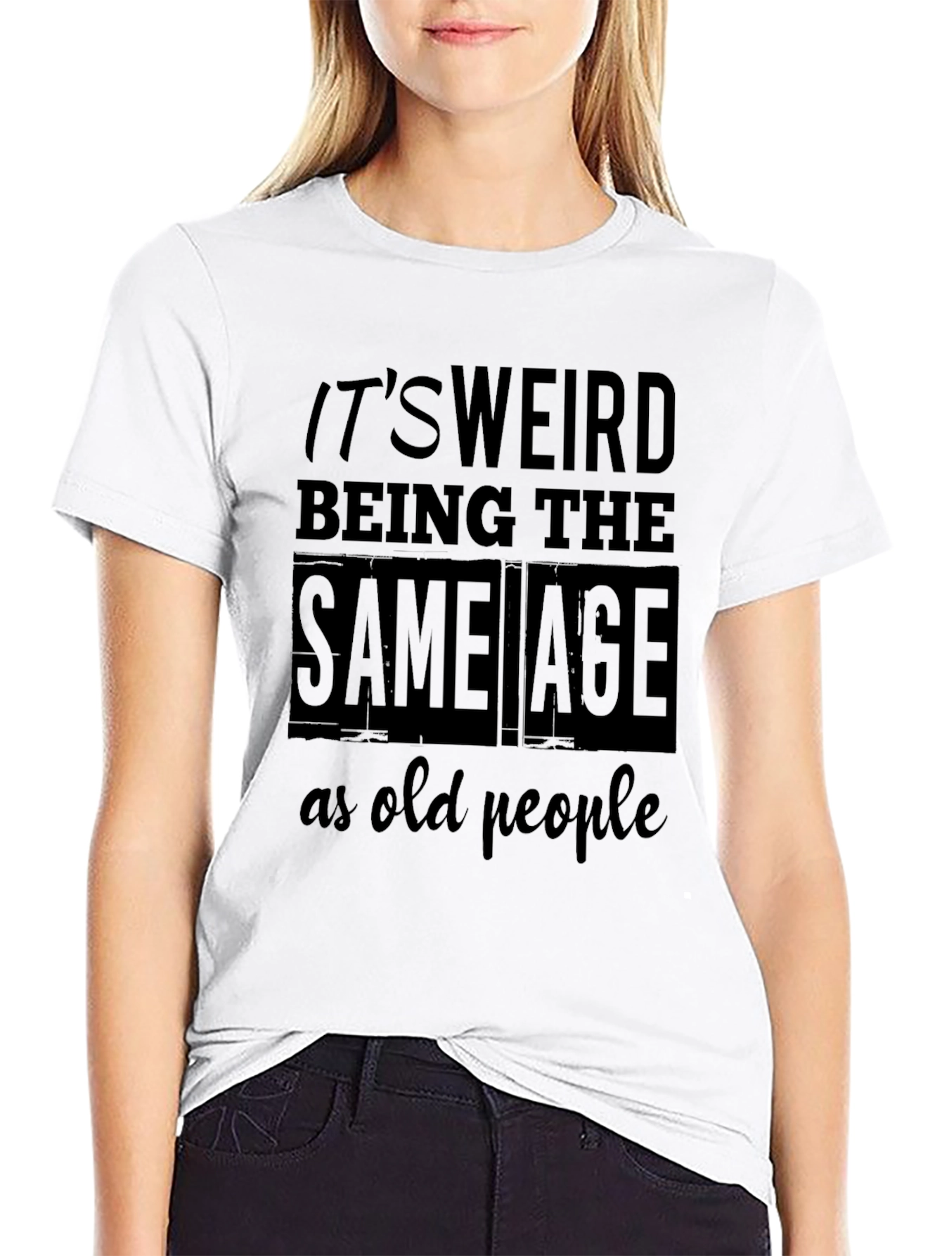 This classic black tee features a witty statement: "IT'S WEIRD BEING THE SAME AGE as old people." Made from what appears to be soft, breathable fabric, the shirt offers both comfort and style. The design is printed in a bold font, ensuring the message stands out. Ideal for casual wear, this t-shirt is perfect for those with a sense of humor about aging. It's a great conversation starter and a fun way to express yourself. Whether you're running errands, hanging out with friends, or simply relaxing at home, this tee adds a touch of humor to your everyday look.