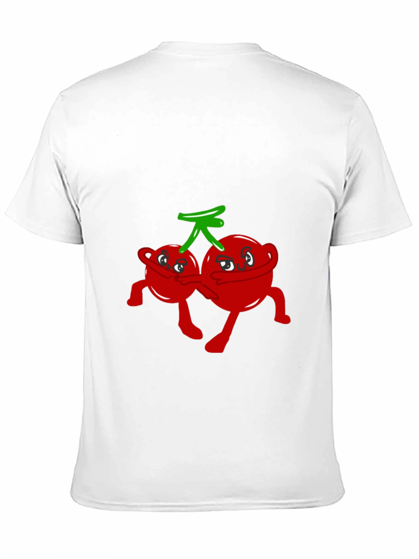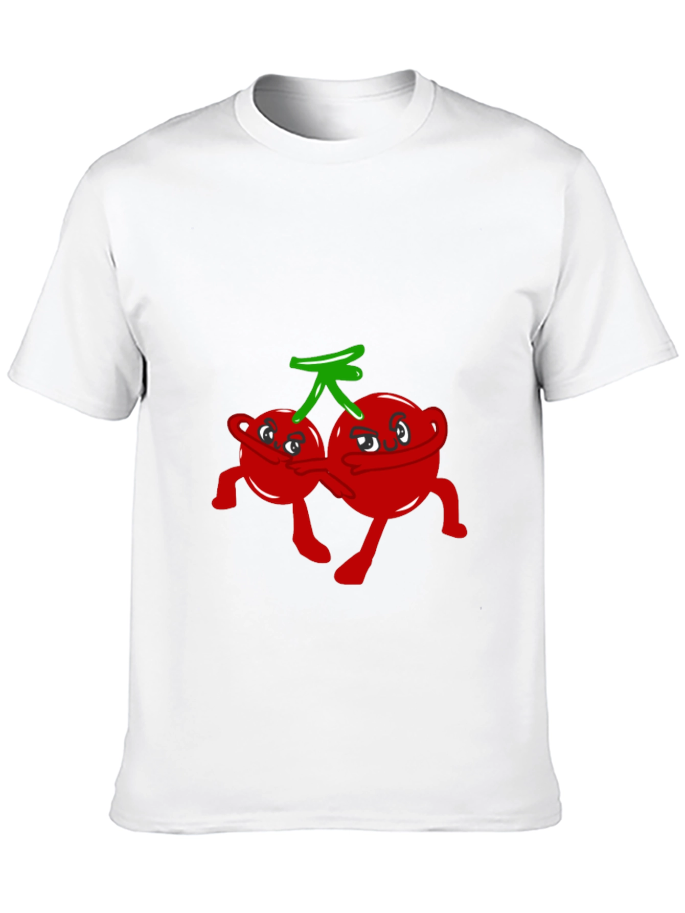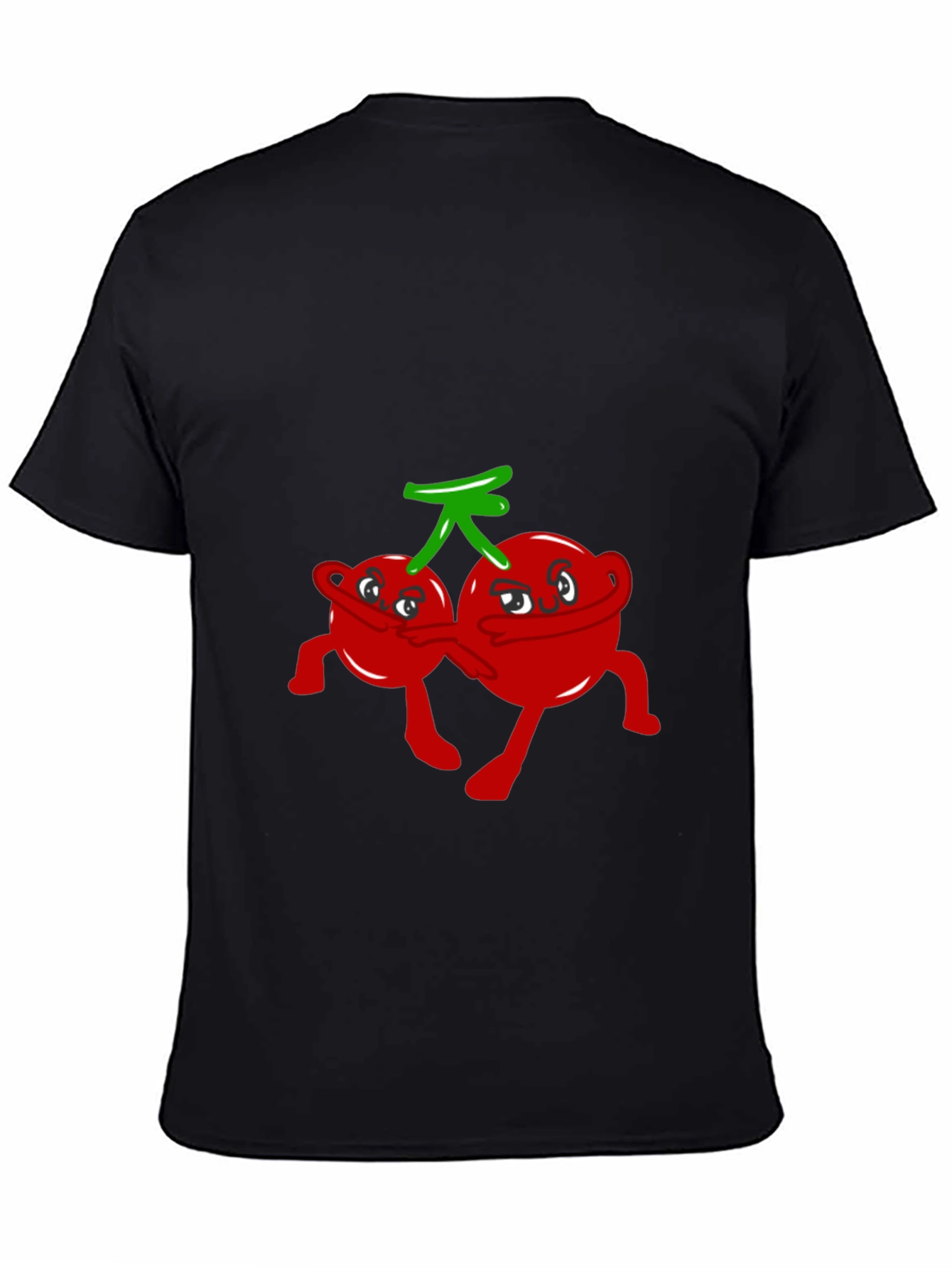 This black t-shirt features a playful graphic of cartoon cherries with faces and limbs, creating a fun and whimsical design. The cherries are bright red with a green stem, providing a vibrant contrast against the dark background. The shirt is made of a soft, comfortable fabric, perfect for casual wear. Ideal for those who love unique and quirky apparel, this tee adds a touch of humor to any outfit. Wear it to casual gatherings, school events, or simply when you want to express your fun-loving personality. This t-shirt is a standout piece that will surely spark conversations and bring smiles.