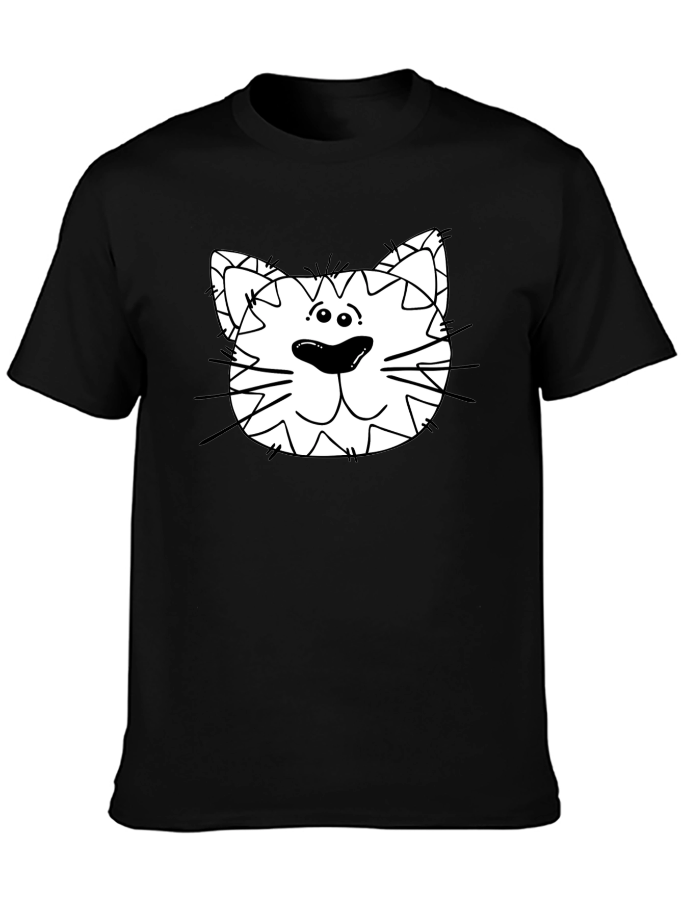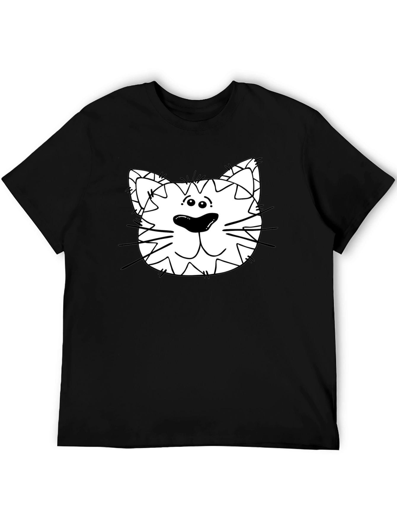 Show off your playful side with this fun men's black t-shirt! This tee features a unique graphic of a cartoon cat face, complete with big eyes, whiskers, and a cute expression. The design is printed on a classic-fit black t-shirt made from soft, breathable fabric. Perfect for casual wear, parties, or as a gift for the cat lover in your life, this eye-catching tee is sure to spark conversations and bring smiles wherever you go. Add some humor to your wardrobe with this statement piece!
