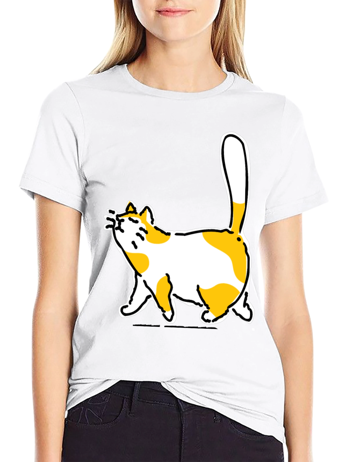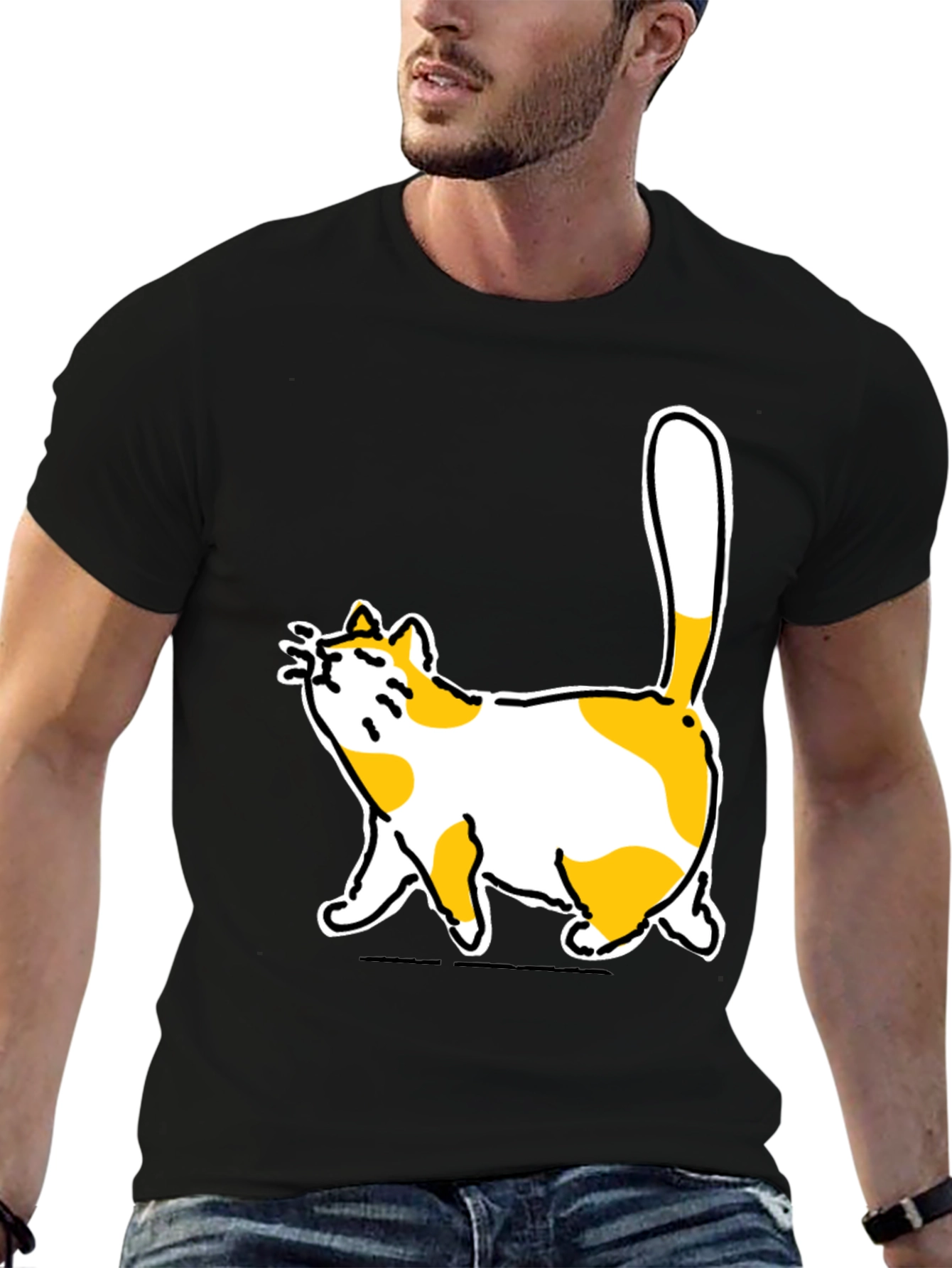 Show off your love for cats with this unique black t-shirt. Featuring a cartoon-style drawing of a cat with white and yellow markings, this tee is perfect for casual wear. The cat design is simple yet eye-catching, making it a great conversation starter. Made from a comfortable, breathable fabric, this shirt is ideal for everyday use. Whether you're running errands, lounging at home, or meeting friends, this cat graphic tee adds a touch of fun to any outfit. A must-have for cat lovers and anyone who enjoys quirky apparel.