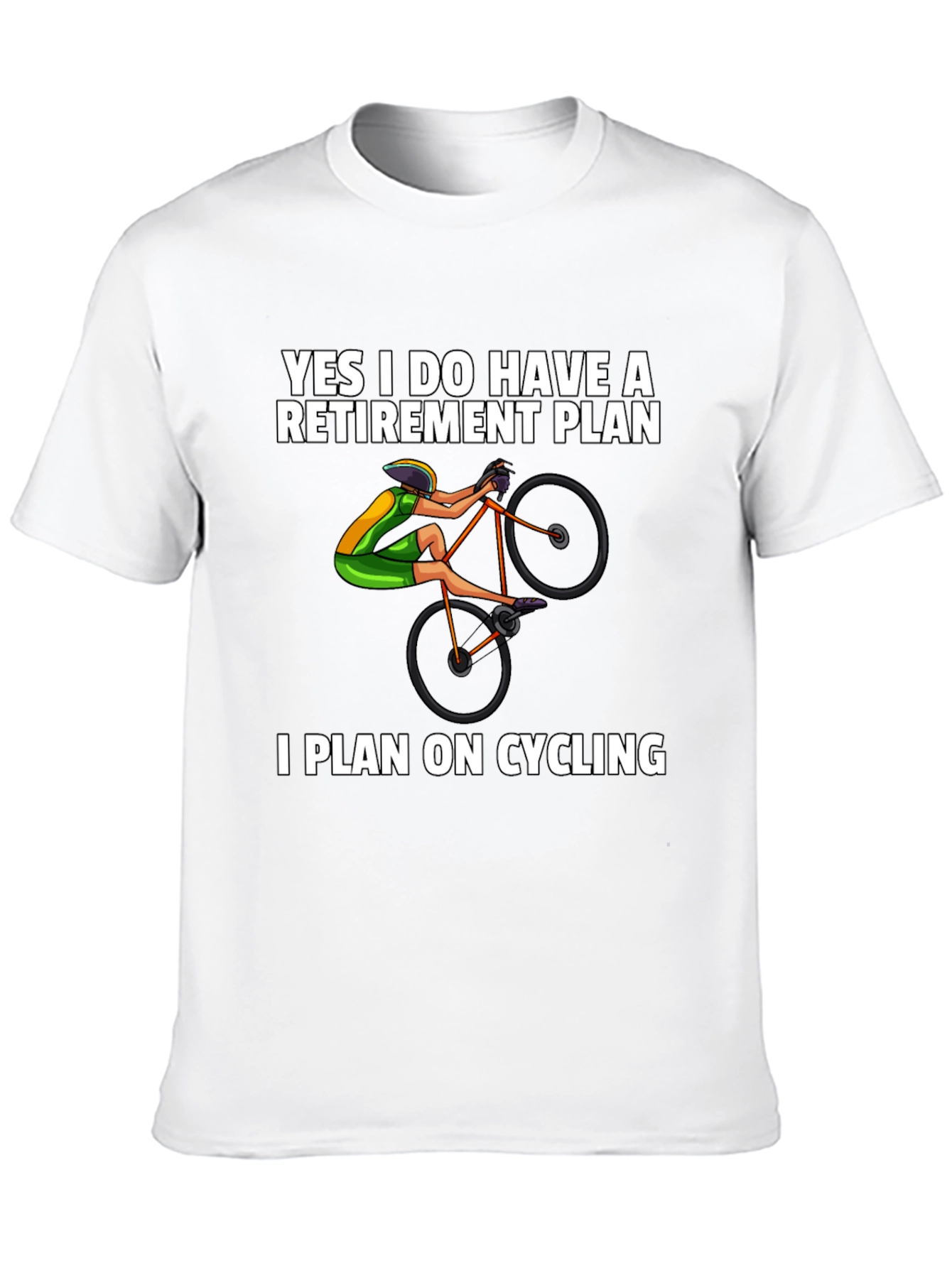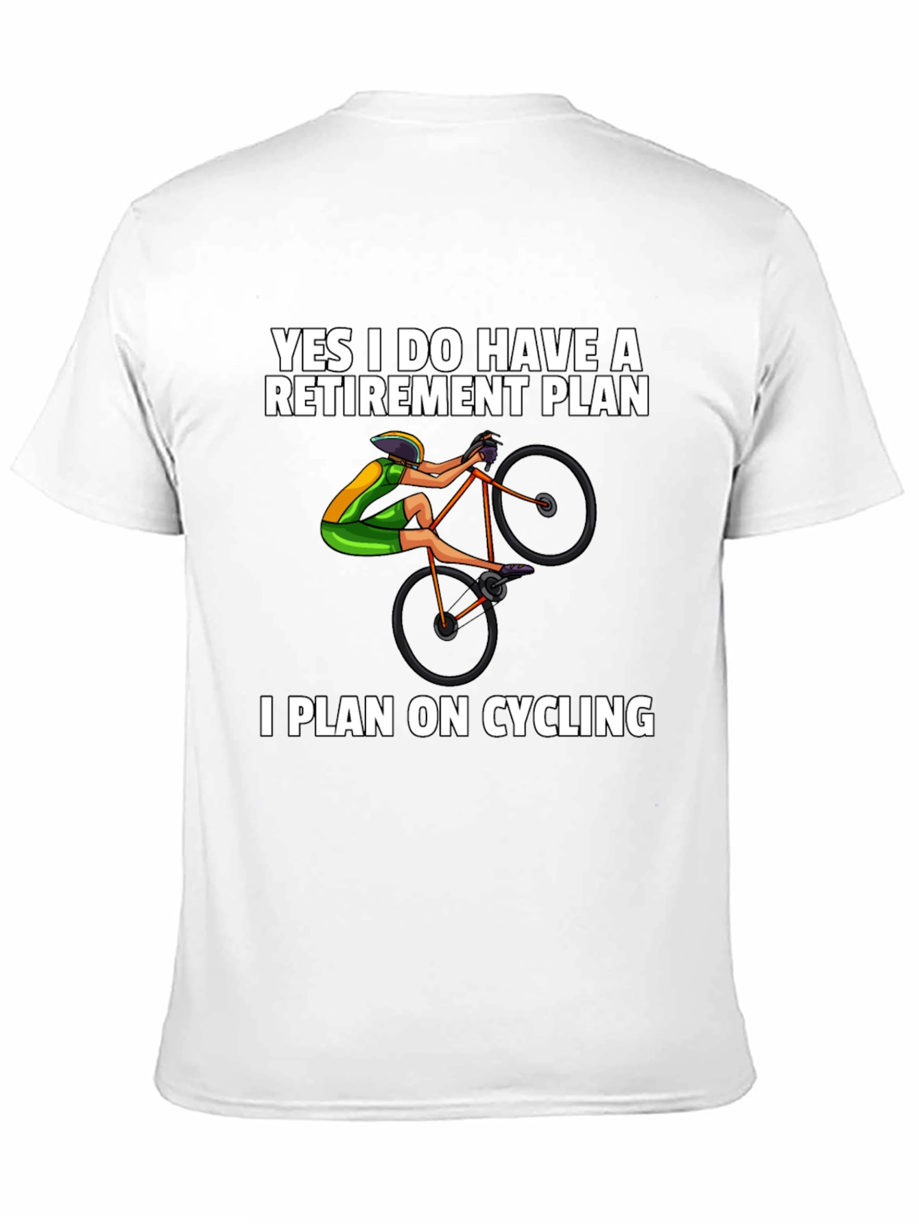 This black t-shirt features a humorous graphic design. The text reads "YES I DO HAVE A RETIREMENT PLAN. I PLAN ON CYCLING." A cyclist is shown performing a wheelie. The design suggests a love for cycling and a playful approach to retirement planning. The shirt appears to be made of a comfortable fabric, ideal for casual wear. Show off your passion for cycling with this unique statement piece, great for everyday use, bike rides, or as a gift for the cycling enthusiast in your life.