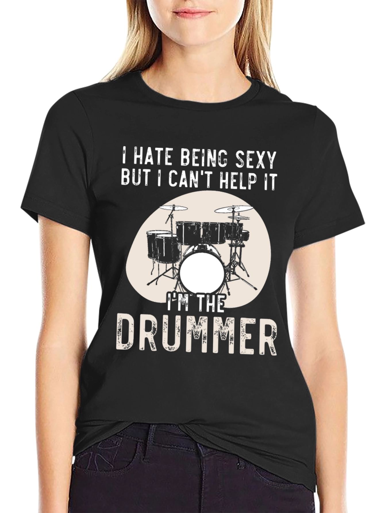 Rock out in style with this humorous black t-shirt! This tee features the statement "I Hate Being Sexy But I Can't Help It" above a drum kit graphic. Below, the phrase "I'm The Drummer" completes the bold design. The vintage-style print adds a touch of retro cool. Made from a comfortable-looking fabric, this t-shirt is perfect for casual wear, band practice, or a night out with fellow musicians. Show off your drumming pride and sense of humor with this eye-catching tee.