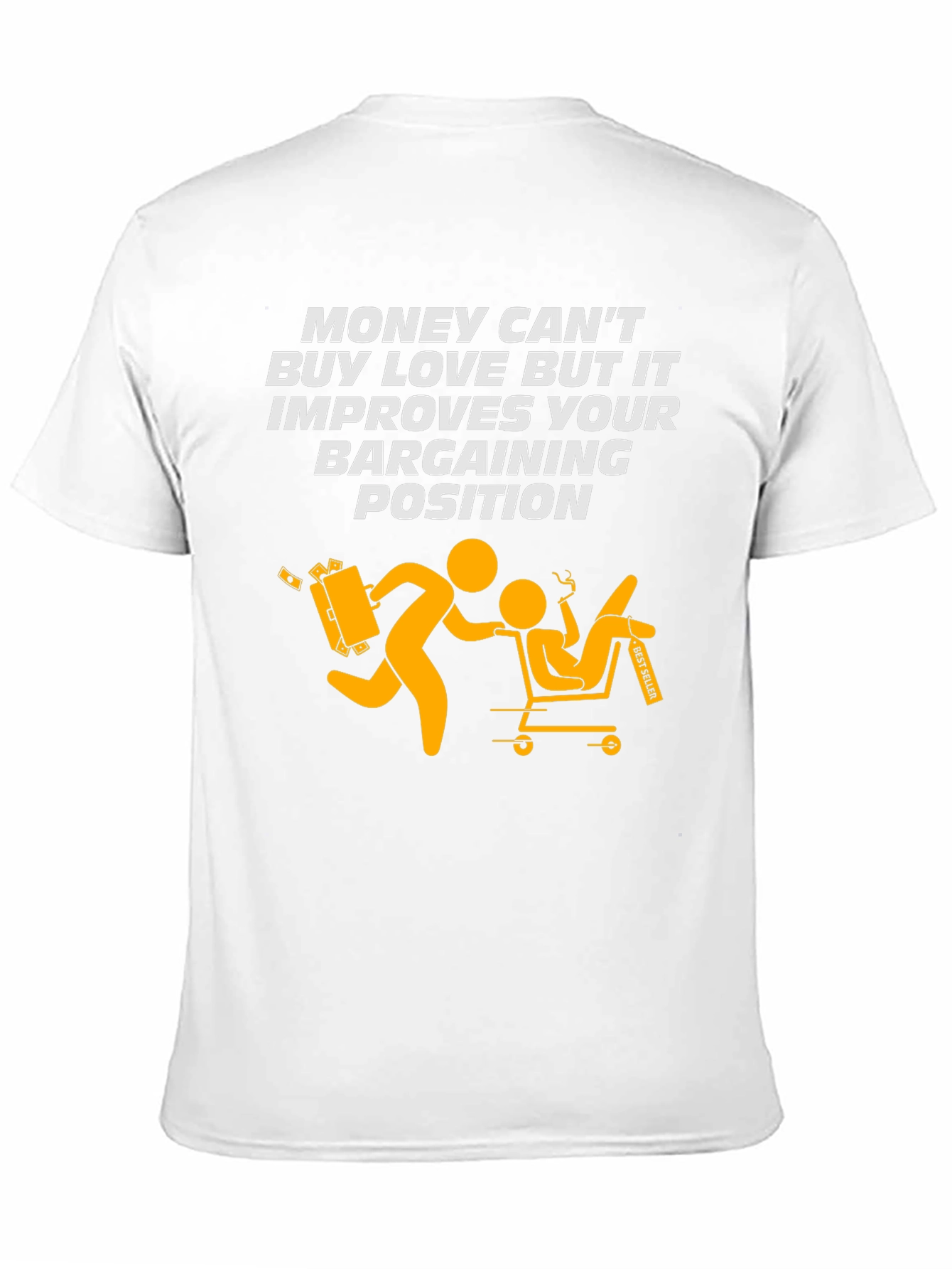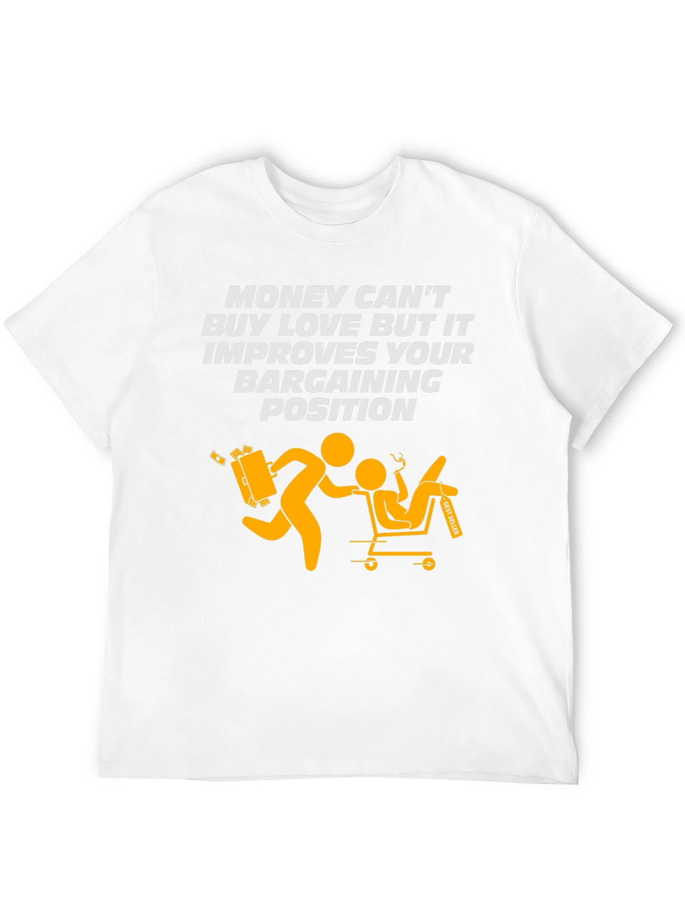 This black graphic tee makes a statement with its humorous design. The print features the phrase "MONEY CAN'T BUY LOVE BUT IT IMPROVES YOUR BARGAINING POSITION" in bold white letters. Below, a quirky graphic illustrates the saying with a person pushing another in a shopping cart. Ideal for casual wear, this t-shirt is perfect for those with a sense of humor and a love for clever designs. The relaxed fit ensures comfort for everyday wear. Stand out from the crowd and spark conversations with this unique and eye-catching tee!