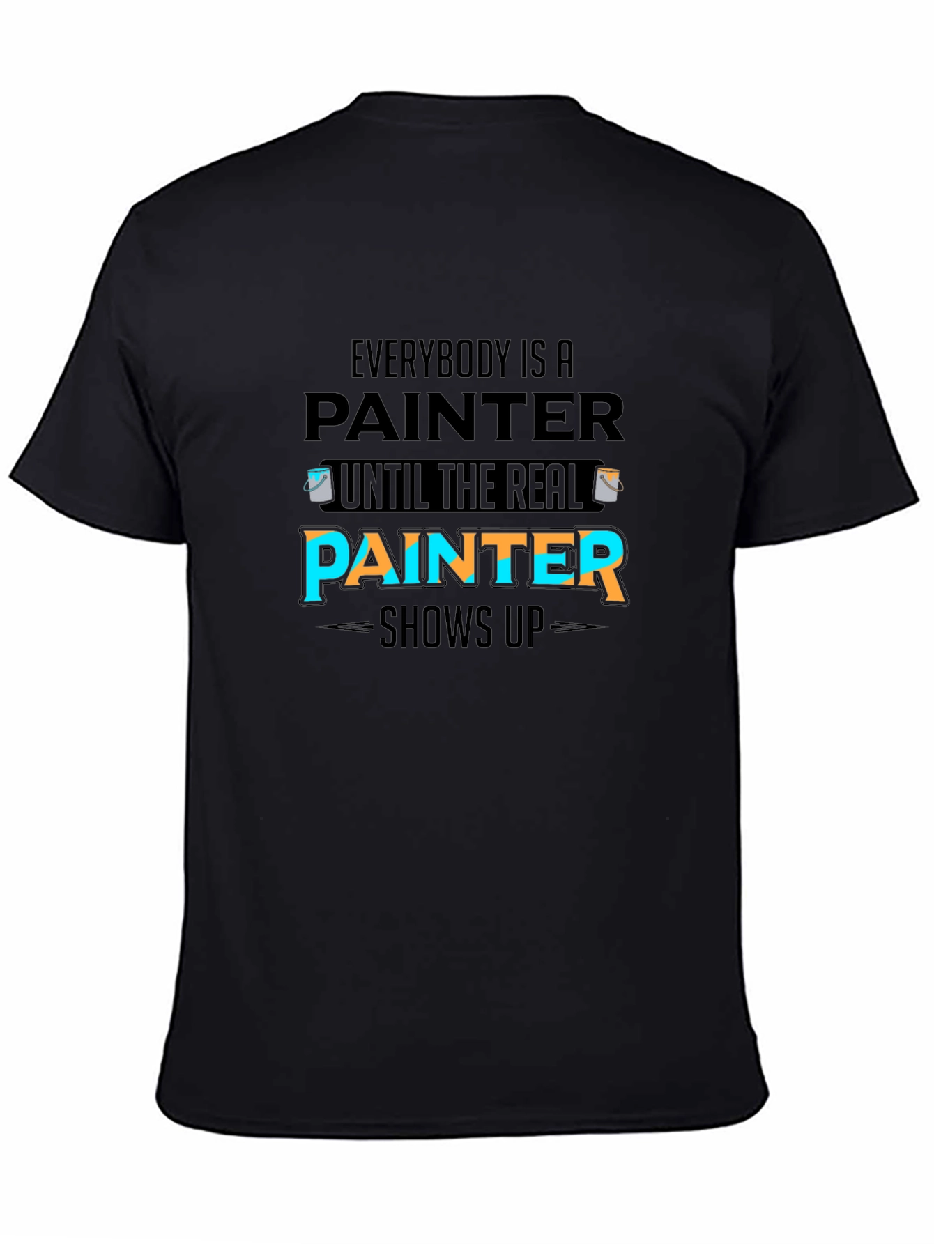 This black t-shirt features a humorous design for painters. The text "EVERYBODY IS A PAINTER UNTIL THE REAL PAINTER SHOWS UP" is prominently displayed in a stylish font, with the word 'PAINTER' highlighted in blue and orange. Two paint cans flank the upper word. The shirt appears to be made of a comfortable, soft material. It's a great way to show off your profession with a touch of humor. Perfect for painters, decorators, or anyone in the painting industry. It's a casual and fun addition to your wardrobe. Make a statement and let everyone know when the real painter arrives!
