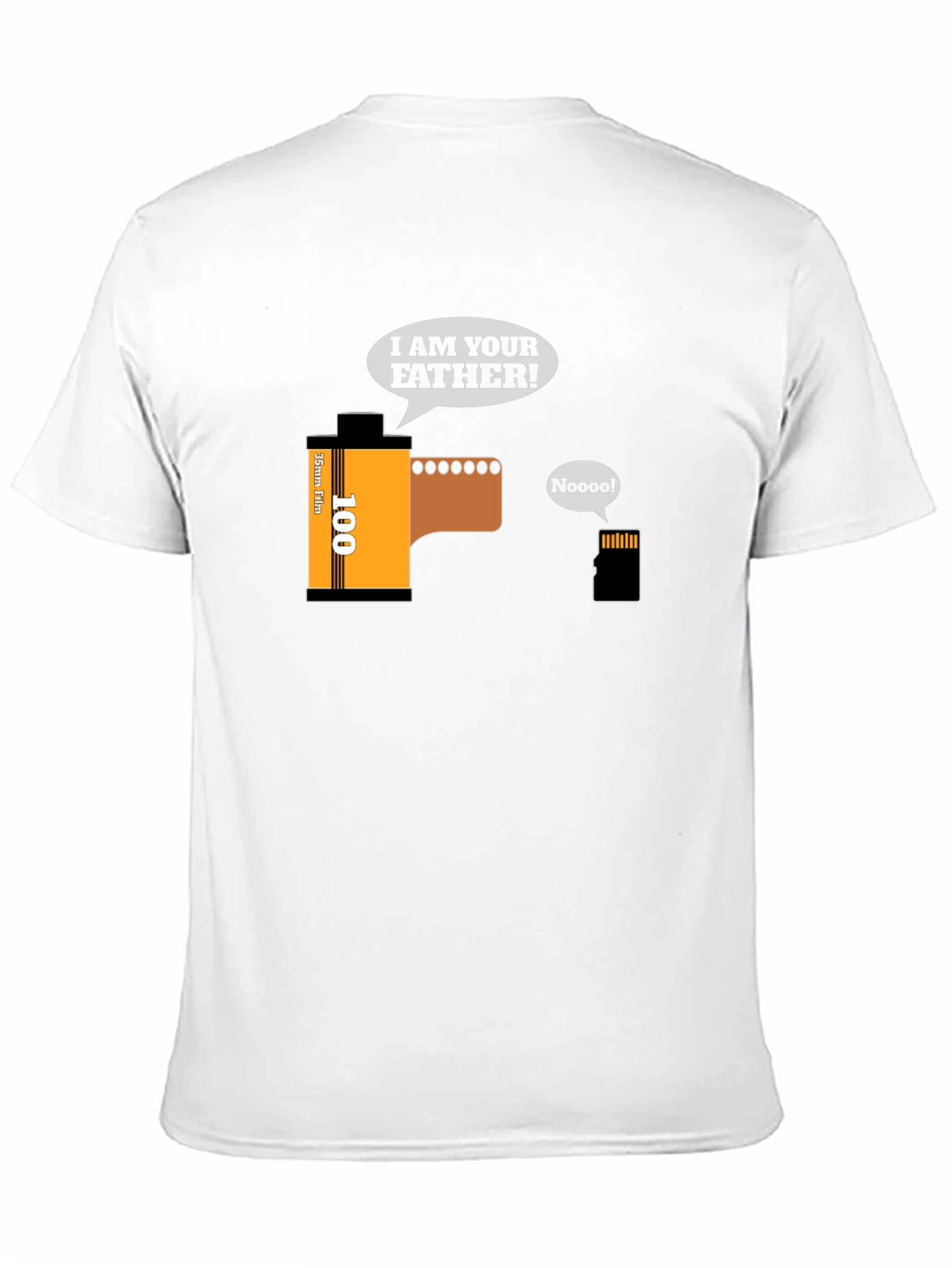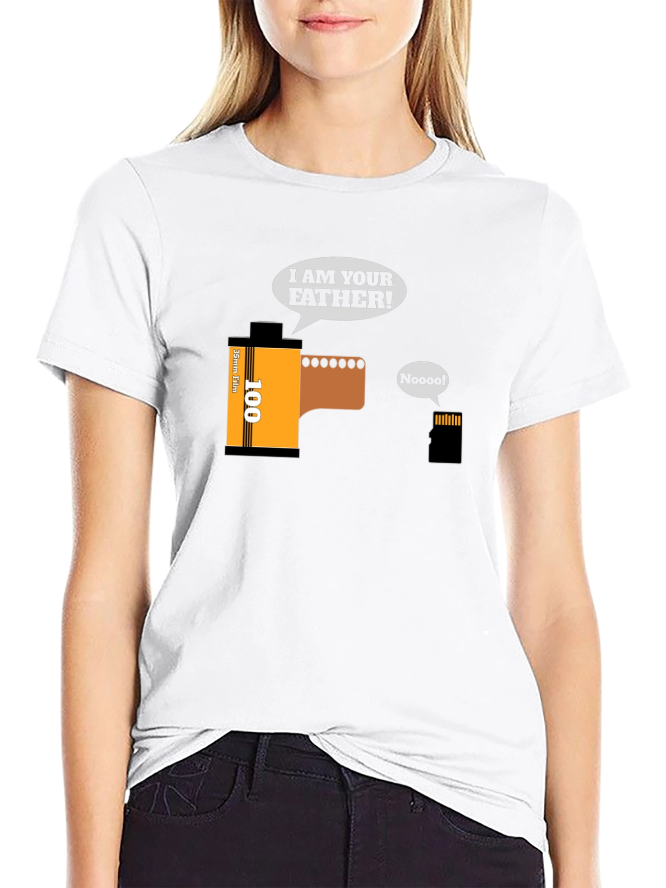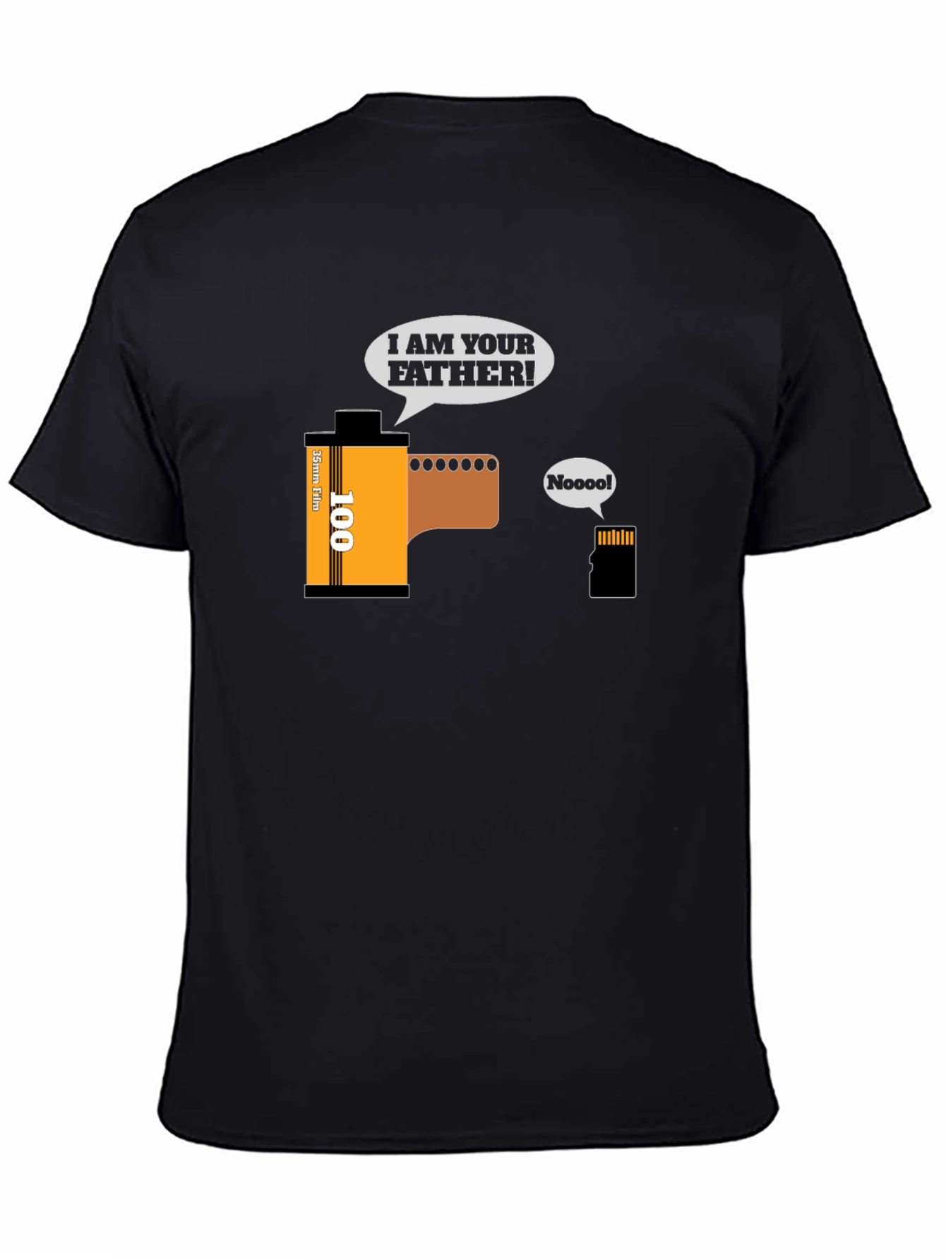 This unique graphic tee features a clever design for photography enthusiasts. The black t-shirt showcases a classic film roll humorously declaring "I AM YOUR FATHER!" to a modern SD card, who replies "Noooo!". This clever parody plays on the evolution of photography storage. Made from what appears to be a soft, comfortable cotton blend, this shirt is perfect for casual wear. Show off your love for photography and geeky humor with this conversation-starting t-shirt. Ideal for photographers, film buffs, or anyone who appreciates a good pun. A great gift!