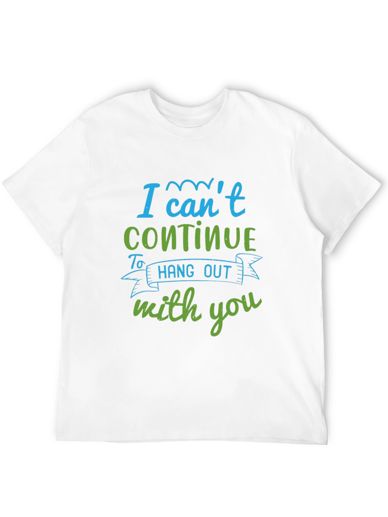 This classic fit black t-shirt features a witty statement in a two-tone color scheme. The phrase 'I can't continue to hang out with you' is printed in a combination of teal and green fonts, with a stylish ribbon graphic accentuating the 'hang out' text. Made from a soft, comfortable fabric, this shirt is perfect for casual wear and expressing your unique sense of humor. Wear it to parties, social gatherings, or just lounging around to spark conversation and show off your fun personality. This is a great way to express yourself with comfort and style.