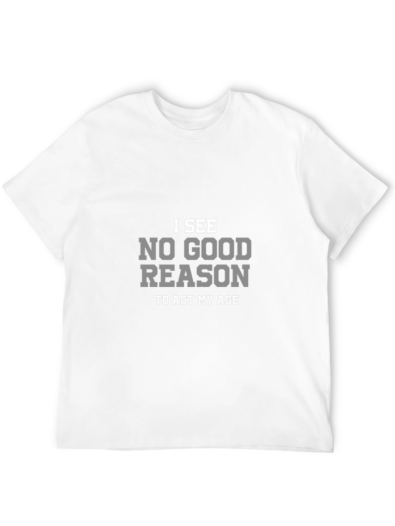 This black t-shirt features a humorous slogan, "I SEE NO GOOD REASON TO ACT MY AGE", perfect for those with a playful spirit. The print is bold and eye-catching, set against the classic black backdrop of the shirt. The t-shirt has a classic fit with short sleeves. Crafted from a soft and comfortable fabric, this t-shirt offers a relaxed fit for everyday wear. It's a great conversation starter and an ideal gift for friends and family who appreciate a good laugh. Wear it casually or dress it up with a jacket for a unique look.
