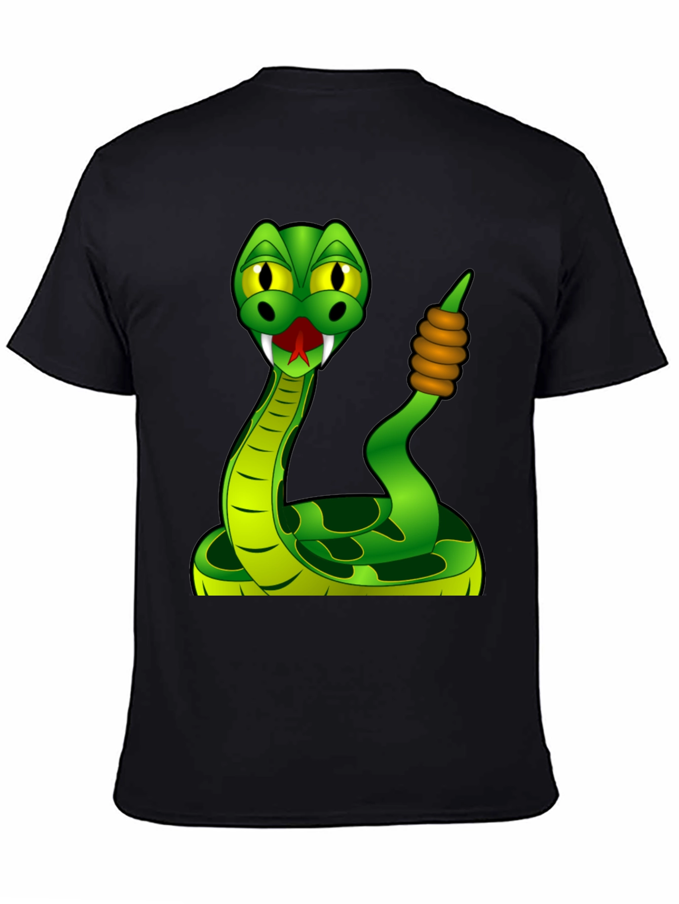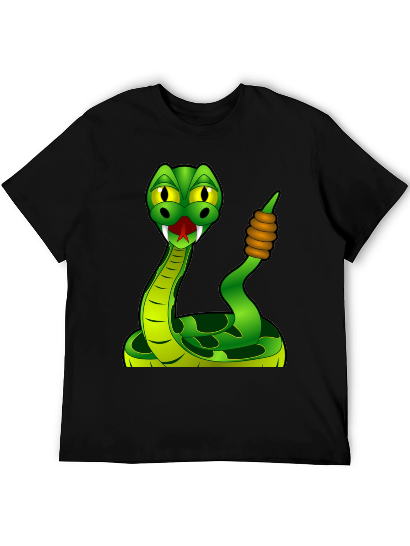 Show off your playful side with this unique graphic tee! This black t-shirt features a vibrant cartoon snake design. The snake is bright green with darker green markings, yellow eyes, and a red tongue. It appears to be holding its tail with brown bands around it, giving it a whimsical and fun look. Made from a soft, comfortable material, this shirt is perfect for casual wear. Ideal for reptile lovers or anyone who enjoys quirky, eye-catching apparel. Makes a great conversation starter!