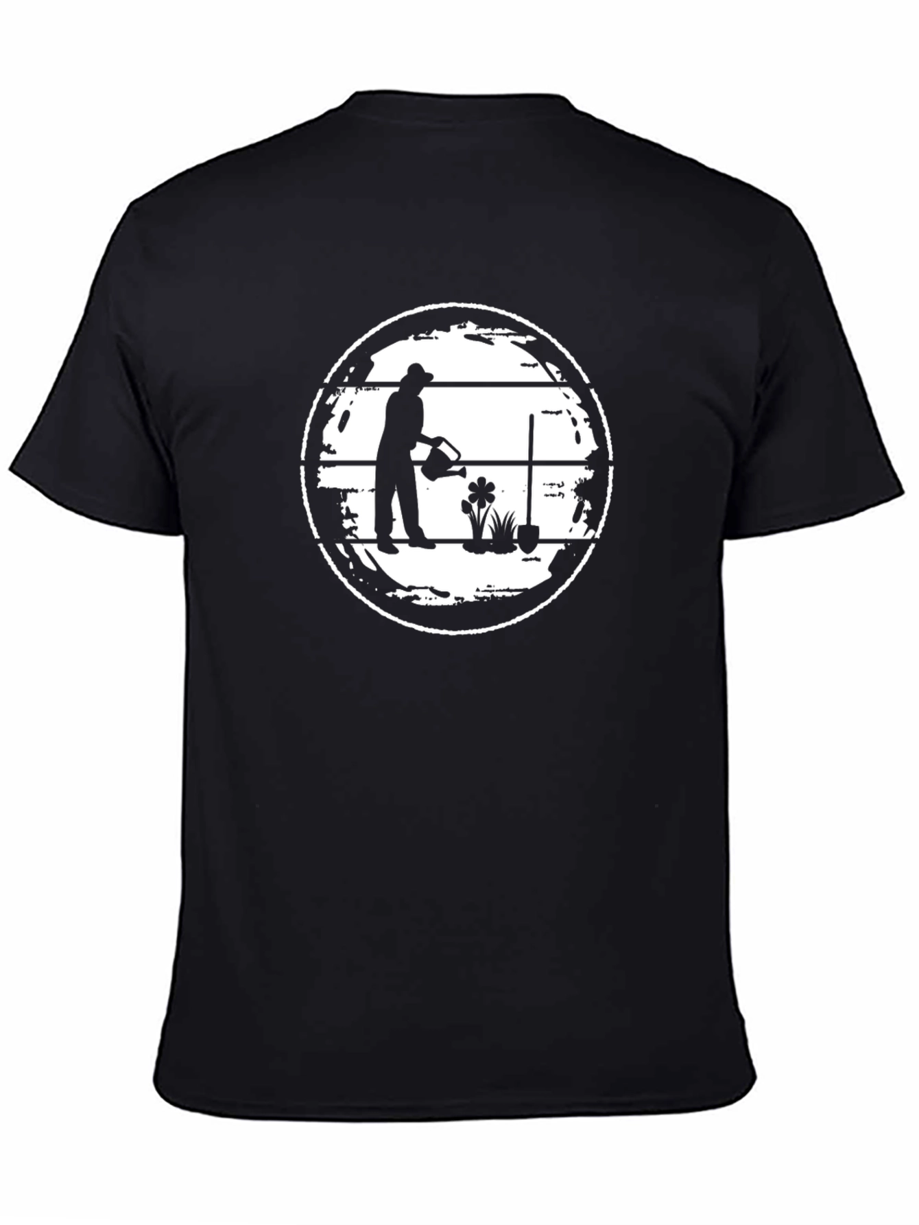 Show off your love for gardening with this stylish black tee! The shirt features a unique graphic of a gardener silhouette watering plants within a distressed circle design. Made from comfortable cotton, this tee is perfect for casual wear, gardening enthusiasts, or anyone who appreciates a touch of nature-inspired style. The dark color provides a versatile backdrop for the bold graphic. Stand out with this unique and eye-catching t-shirt! This shirt is durable enough to withstand a few washes while keeping its design. Great for any occasion!