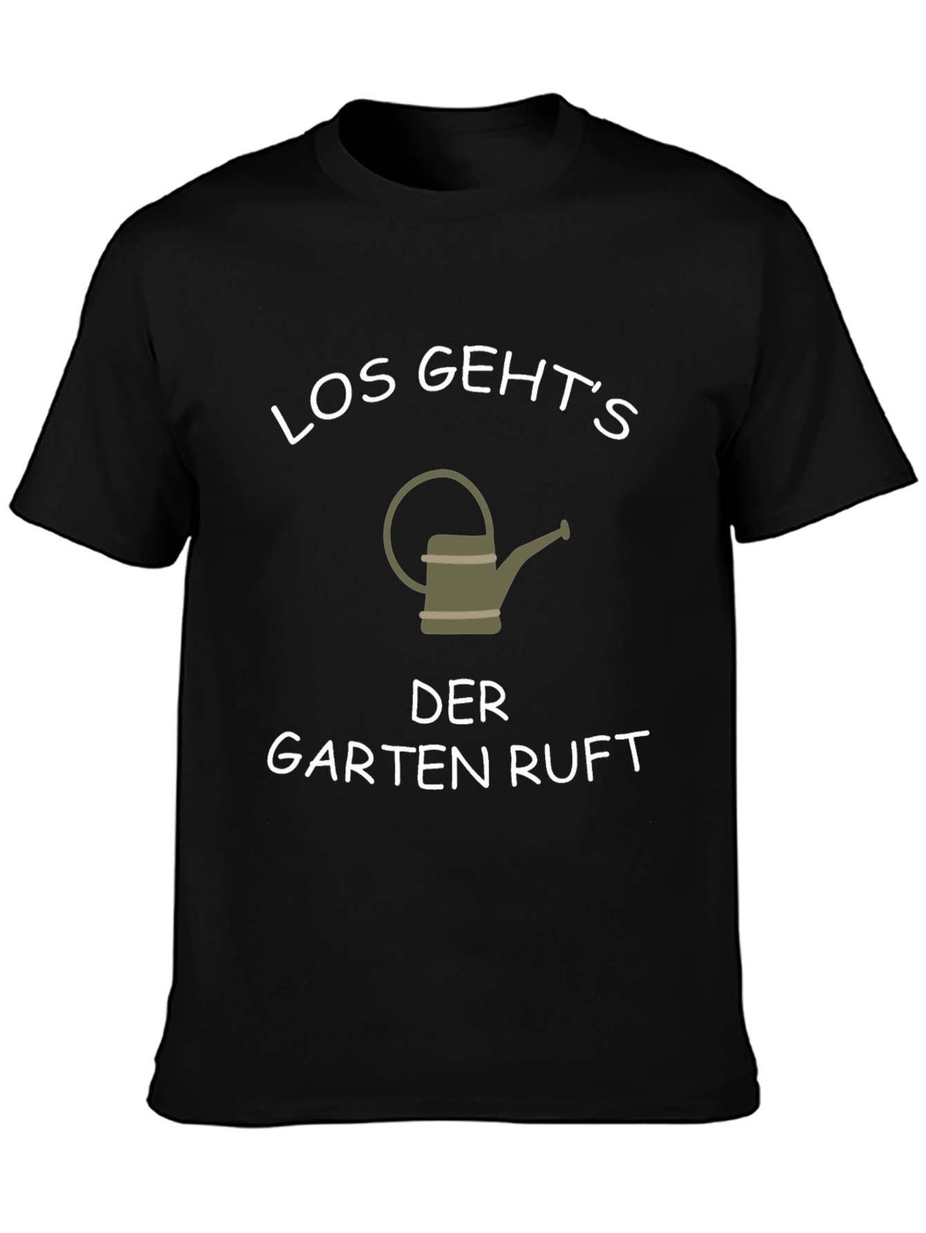 This black t-shirt features a playful and lighthearted design, perfect for gardening enthusiasts. The shirt displays a graphic of a watering can alongside the German phrase "Los Geht's DER GARTEN RUFT", suggesting a call to the garden. Made from what appears to be a soft and comfortable material, this tee is ideal for casual wear while tending to your plants or simply showing off your green thumb. Its classic fit makes it a versatile addition to any wardrobe. This t-shirt would be a great gift for gardeners!
