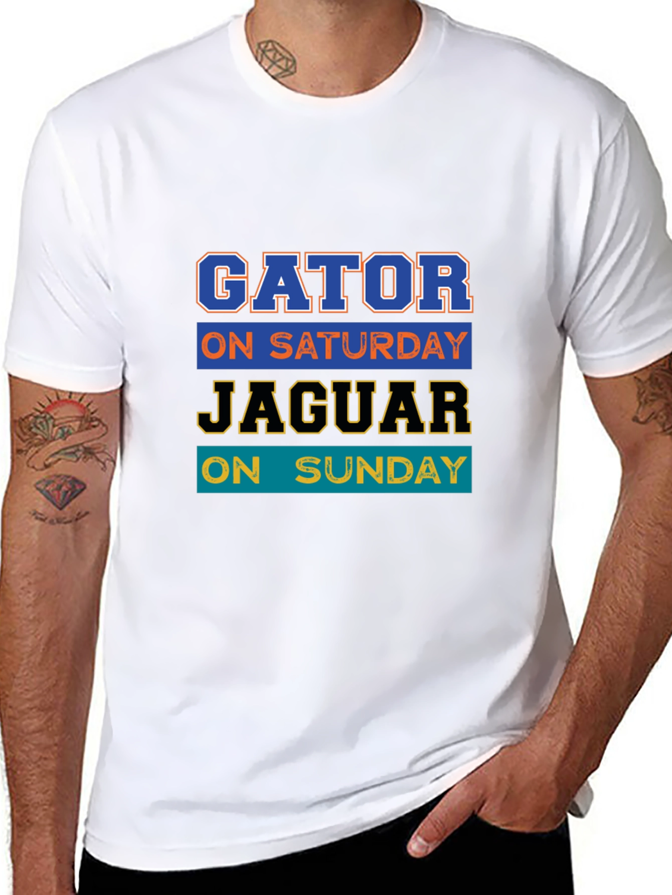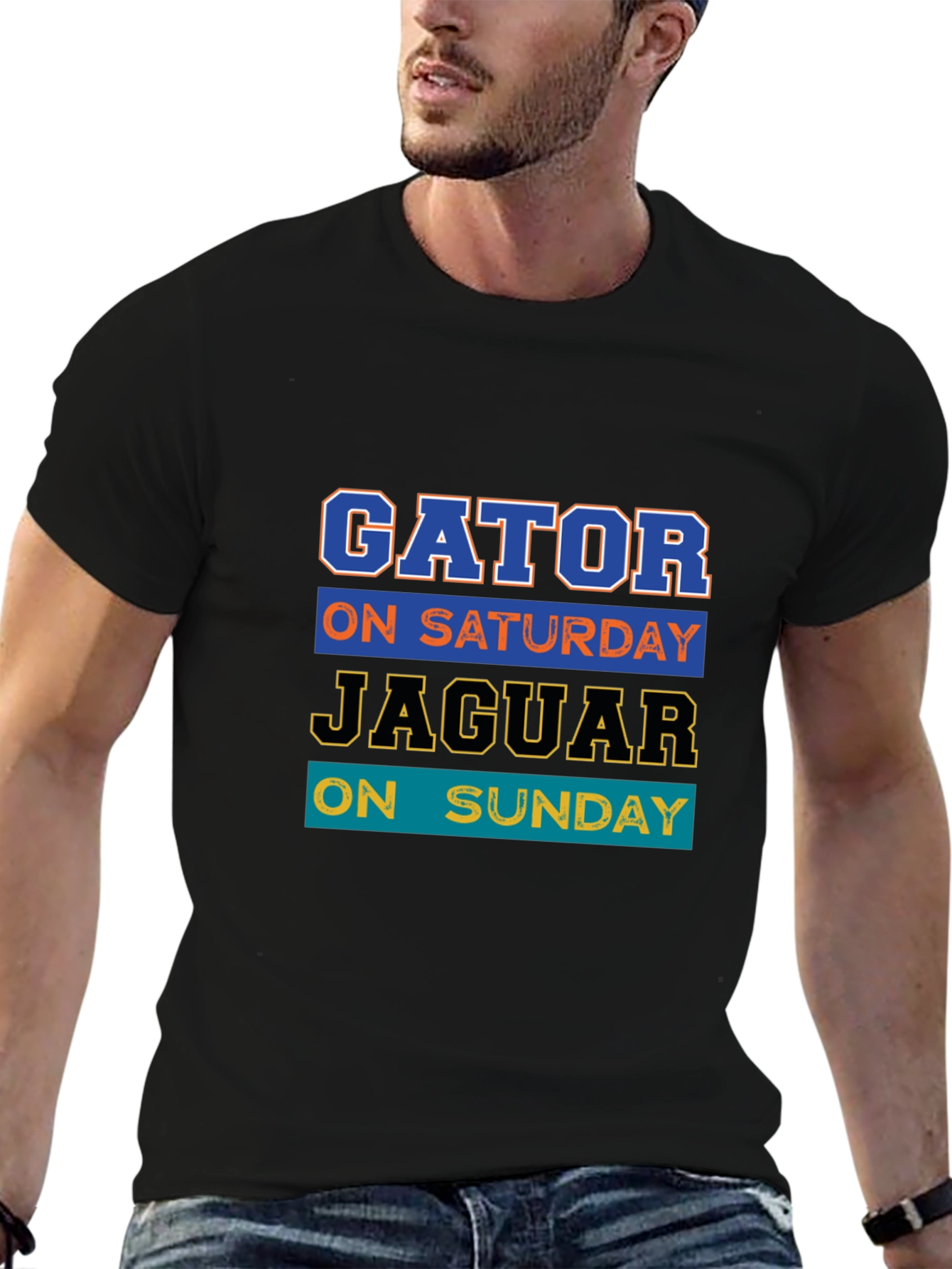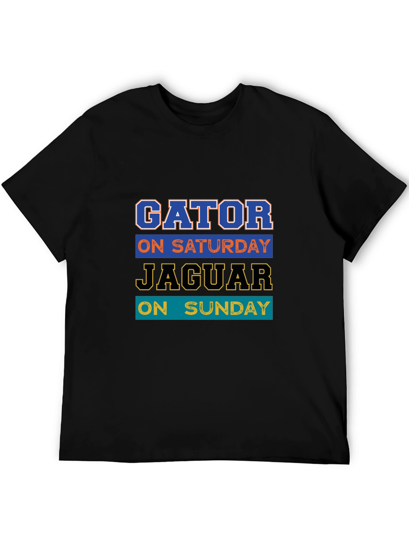 Show your team spirit with this stylish black graphic t-shirt. This tee features a vibrant design with the text "GATOR ON SATURDAY JAGUAR ON SUNDAY" in layered colors and sporty fonts. The design makes it a great choice for game days, casual wear, or as a gift for sports enthusiasts. Pair it with jeans or shorts for a comfortable and casual look. Made from a soft and breathable fabric, this t-shirt ensures all-day comfort and is perfect for any sports fan.