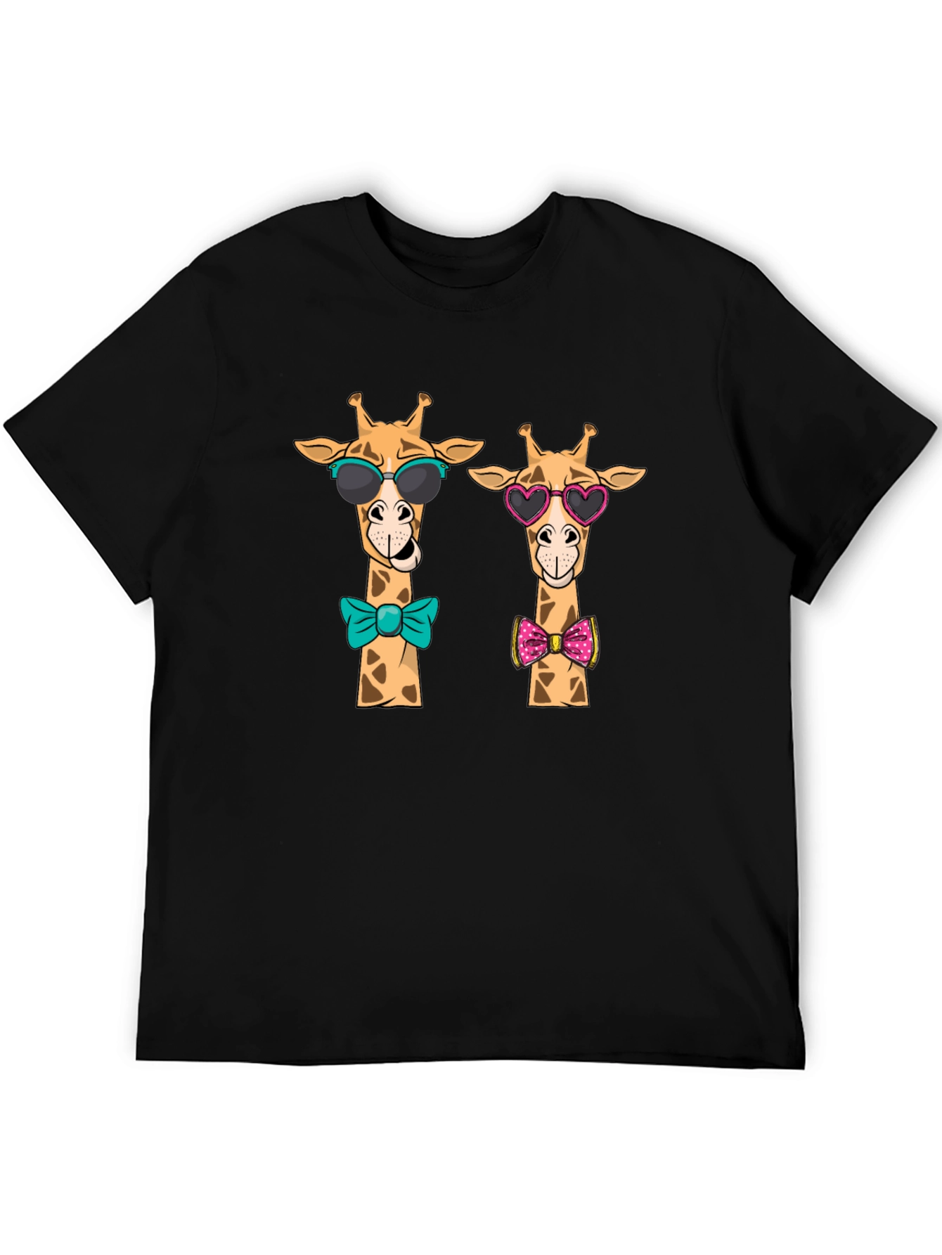 Show off your fun personality with this eye-catching t-shirt. This black tee features a playful graphic of two giraffes, each sporting their own unique style. One giraffe rocks cool sunglasses and a teal bowtie, while the other wears heart-shaped glasses and a pink polka dot bowtie. Made from a soft, breathable fabric, this shirt is comfortable to wear all day long. Perfect for casual outings, parties, or just lounging around. This tee is sure to turn heads and spread smiles wherever you go. A fun, unique addition to your wardrobe!