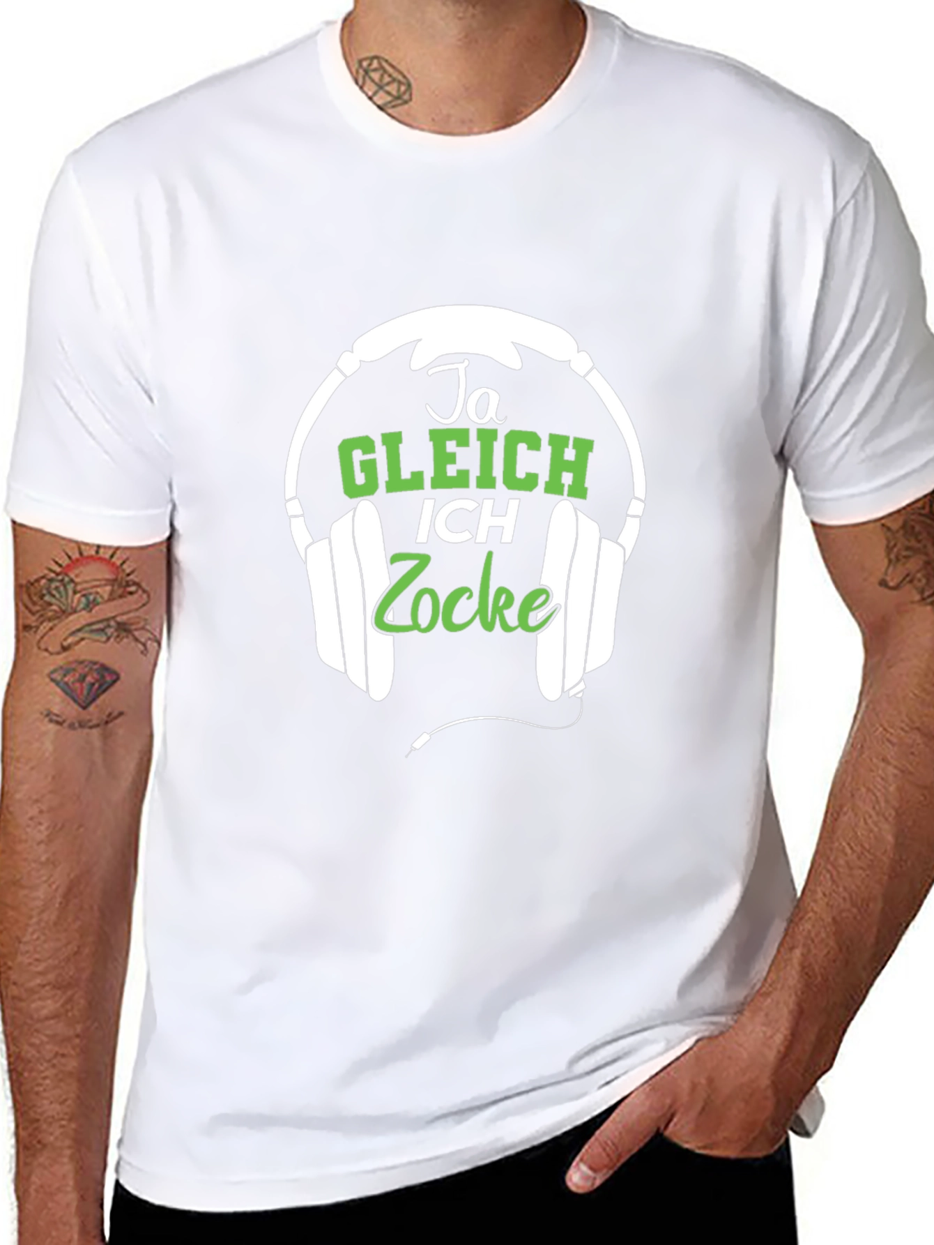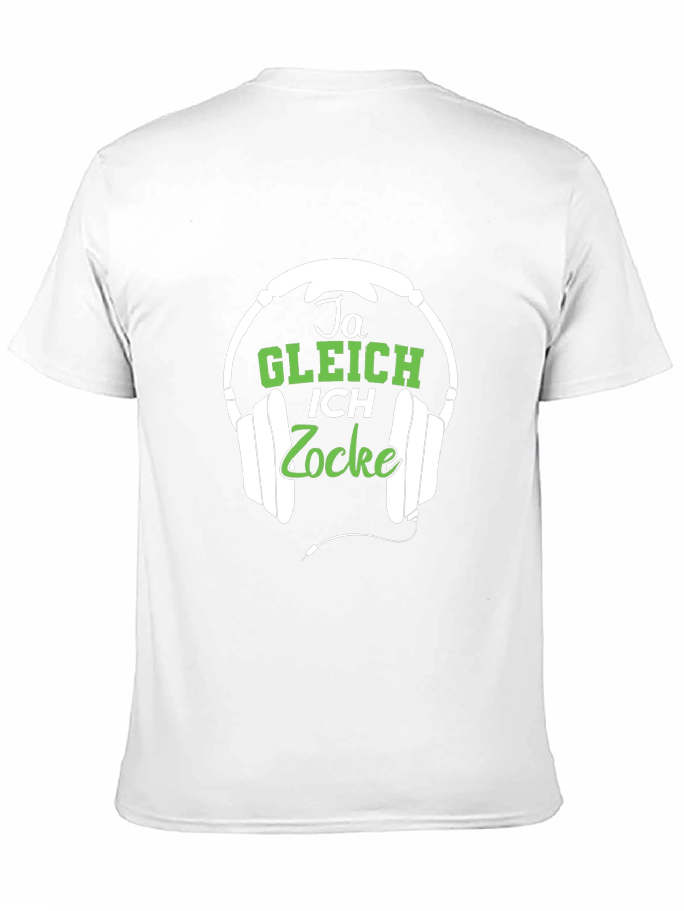 This eye-catching black t-shirt features a unique graphic print perfect for gaming enthusiasts. The design showcases a pair of white headphones framing the German text "Ja Gleich Ich Zocke", which translates to "Yes, I'm gaming soon" or "I'll play soon" and features a playful font in green. Made from what appears to be a soft and comfortable cotton blend, this tee is ideal for casual wear, gaming sessions, or as a fun conversation starter. Show off your love for video games with this stylish and expressive t-shirt. It's a great gift for gamers or a fun addition to your wardrobe.