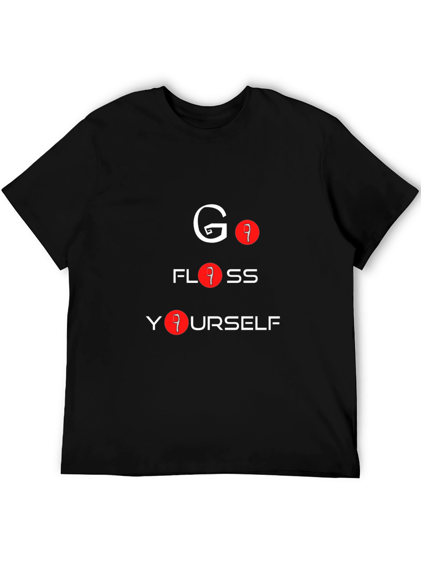 Make a statement with this eye-catching black t-shirt featuring the humorous phrase "Go Floss Yourself". The clever design replaces the letter 'O' with a red circle and a dental floss pick, adding a playful and unique twist. Made from a comfortable, breathable fabric, this tee is perfect for everyday wear. Show off your witty side at social gatherings, casual outings, or simply lounging around. Get ready to turn heads and spark conversations with this fun and stylish graphic tee!