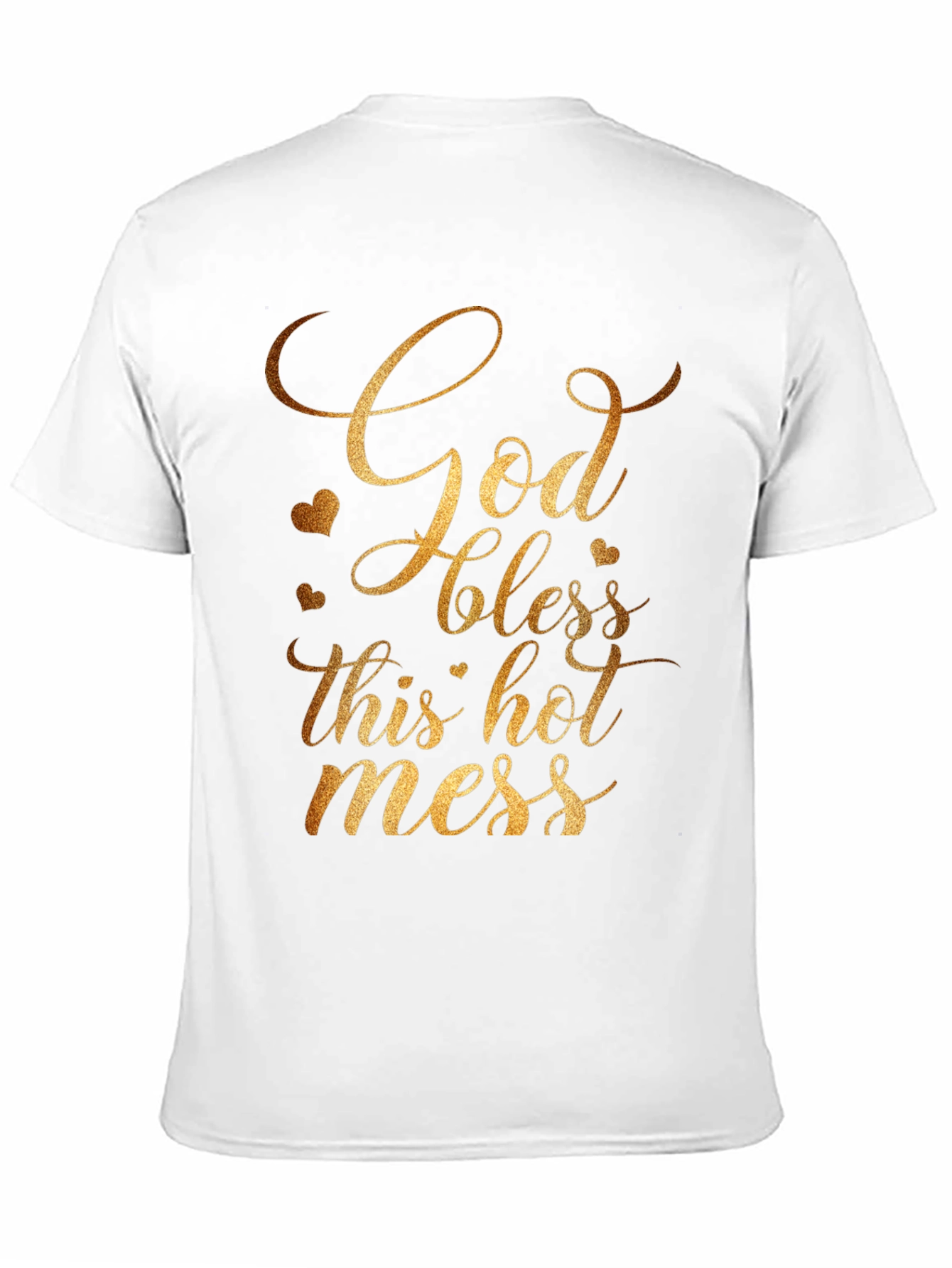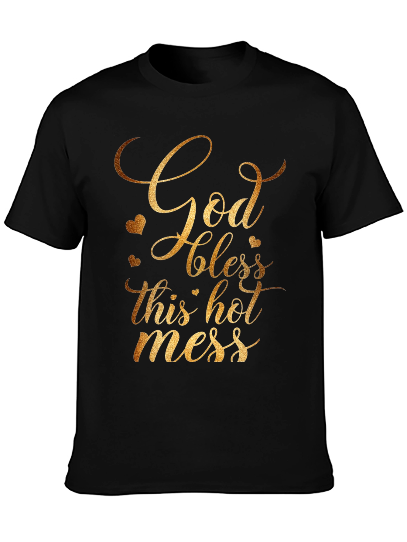 Show off your playful side with this Gildan t-shirt featuring a gold-toned text design that reads "God bless this hot mess." The design also incorporates delicate heart accents, adding a touch of charm. Made from comfortable, breathable fabric, this black tee is perfect for casual wear. Whether you're running errands, relaxing at home, or hanging out with friends, this shirt is sure to spark conversations and bring a smile to those around you. Express your unique personality with this fun and stylish statement piece!
