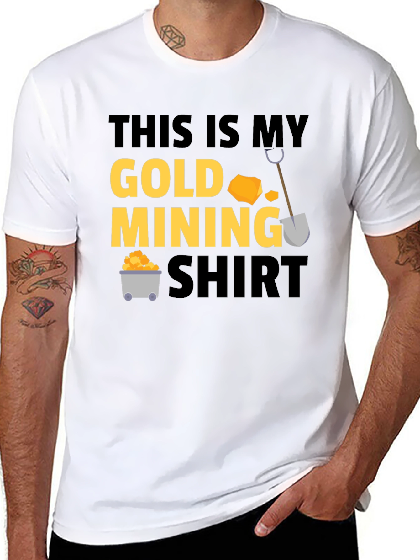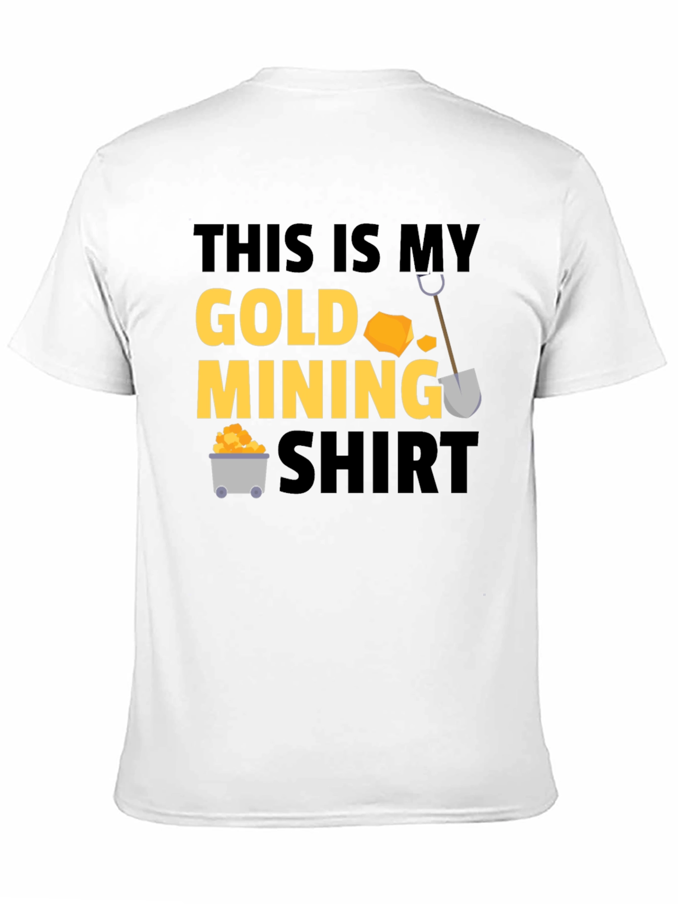 Show off your love for gold mining with this fun and unique t-shirt. This black tee features a bold graphic with gold-colored text that reads 'THIS IS MY GOLD MINING SHIRT,' complete with playful illustrations of gold nuggets, a shovel, and a mining cart. Made from a soft, comfortable fabric, this shirt is perfect for casual wear, mining enthusiasts, or as a novelty gift. Whether you're hitting the gold fields or just hanging out, this shirt is sure to spark conversations and showcase your passion. Get yours today and declare your dedication to the gold rush!
