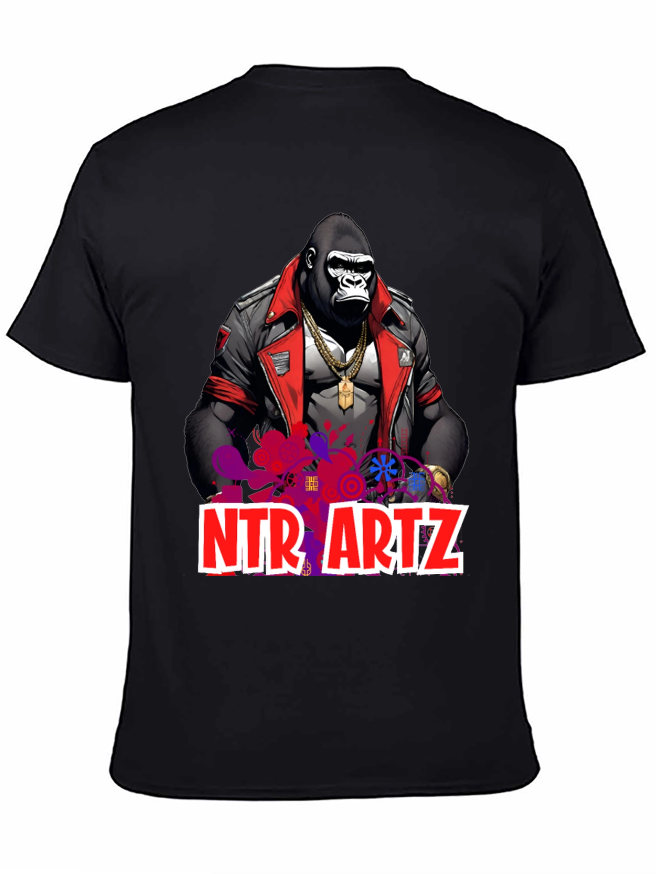 Show off your unique style with this striking men's graphic t-shirt. Featuring a bold design of a stylish gorilla wearing a leather jacket and gold chain, this tee is sure to turn heads. The shirt also has the words NTR ARTZ written in bold red letters across the image. Made from a comfortable, breathable fabric, it's perfect for casual wear or making a statement. The black tee provides a clean canvas for the detailed and colorful design. Perfect for everyday wear, concerts, or as a gift for the art and gorilla lovers in your life.
