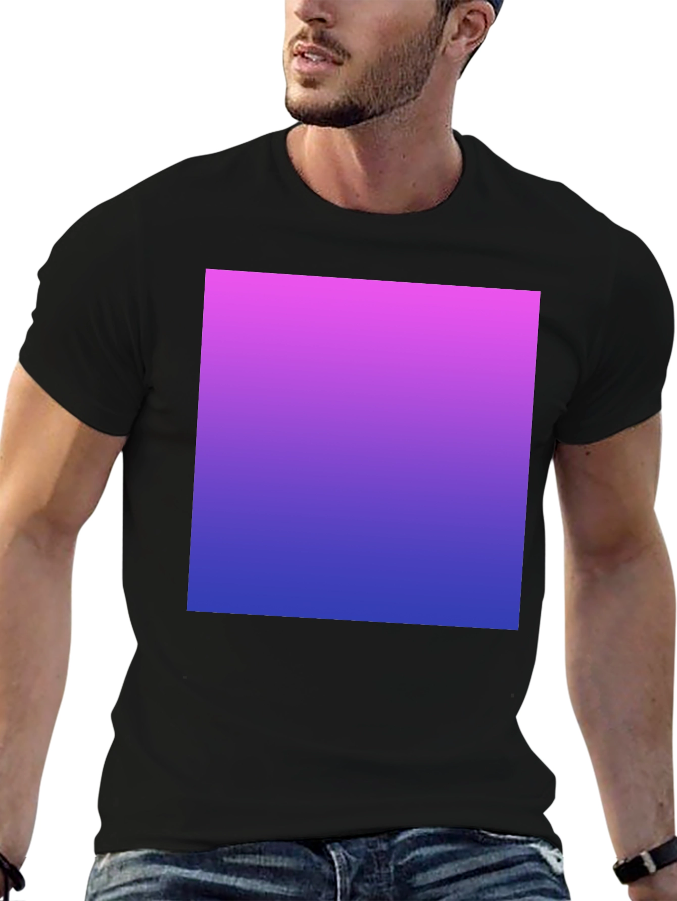 Elevate your everyday style with this striking gradient t-shirt. Crafted from a comfortable black cotton blend, this tee features a vibrant gradient design transitioning from a soft pink at the top to a rich blue at the bottom. The smooth color blend offers a modern and eye-catching look, perfect for adding a pop of color to any outfit. The classic crew neck and short sleeves provide a timeless fit, making it ideal for casual outings, weekend adventures, or layering under a jacket. Make a statement with this unique and stylish gradient t-shirt!