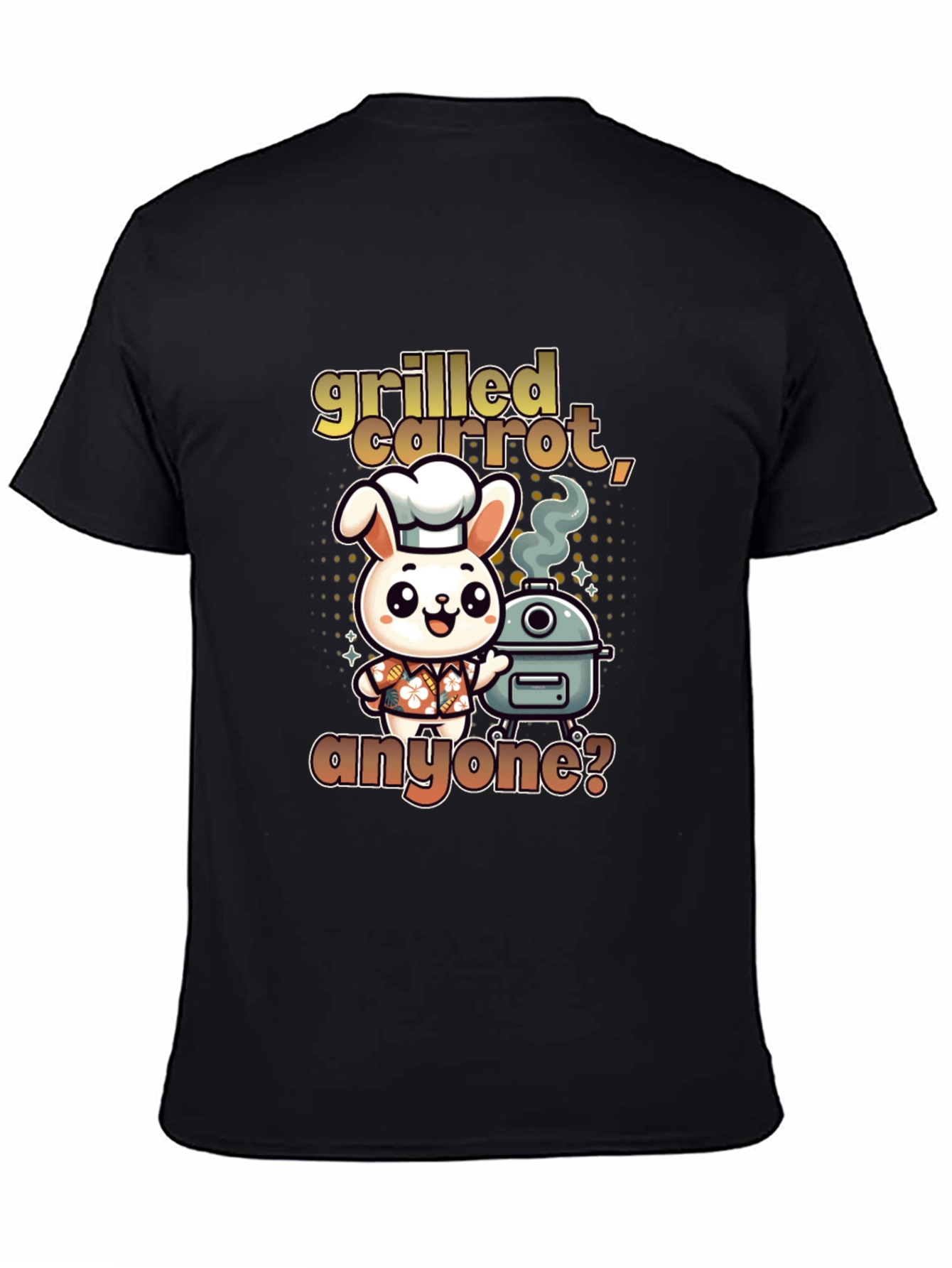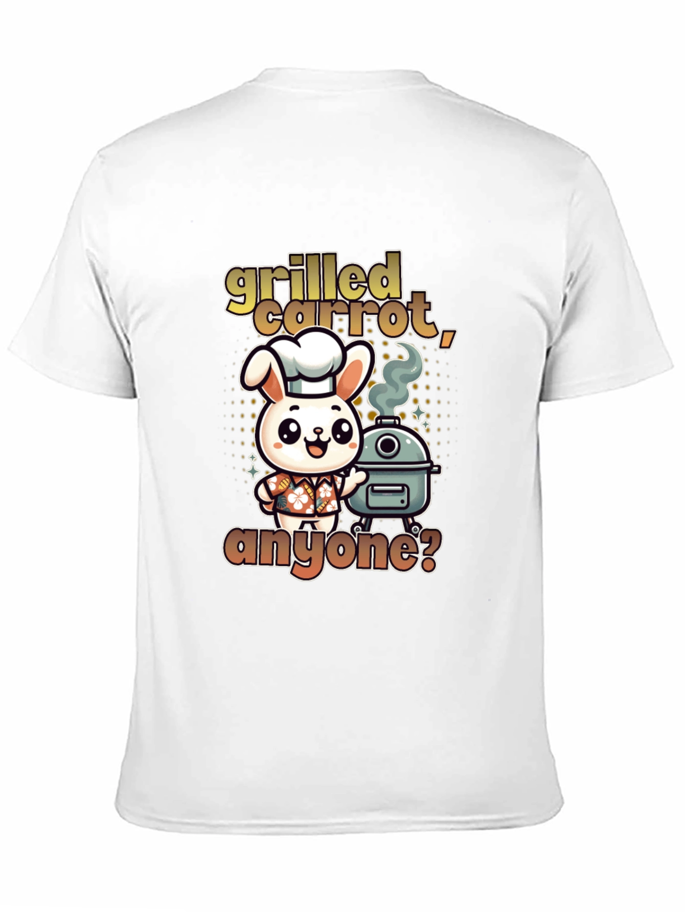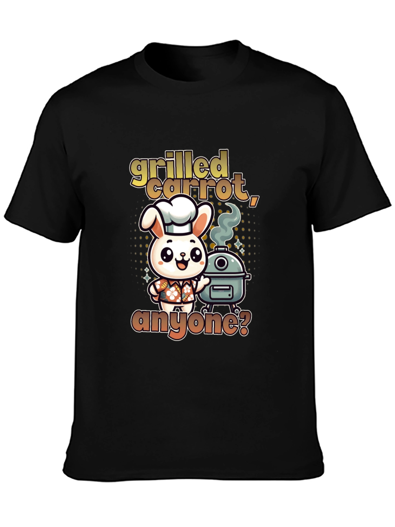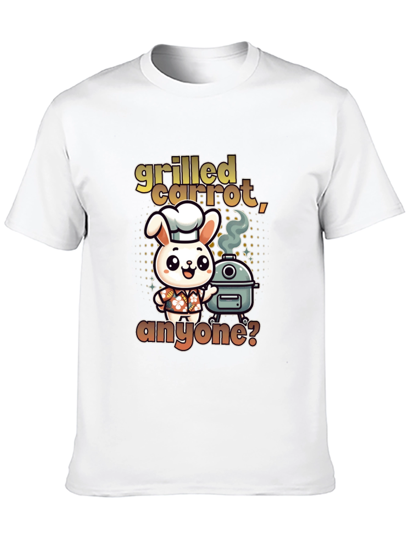 This fun T-shirt features a cartoon bunny chef standing next to a grill, with the text "grilled carrot, anyone?" in a playful font. It's perfect for those who love grilling or have a quirky sense of humor. Made from soft, comfortable fabric, this T-shirt offers a relaxed fit, making it ideal for casual wear or a day at the barbecue. Wear it to your next cookout, a casual gathering, or simply as a fun everyday outfit to make a statement. It's sure to spark conversation and bring a smile to everyone's face.
