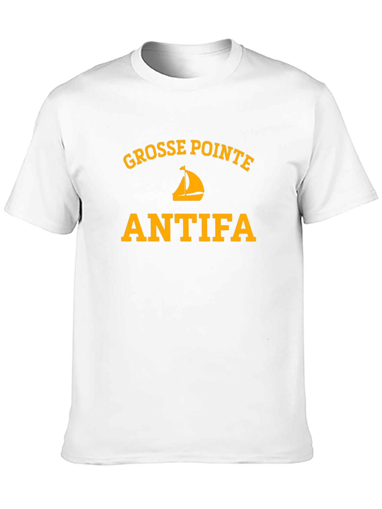 Show off your edgy style with this Grosse Pointe Antifa graphic t-shirt. The bold design features the words 'Grosse Pointe' arched above a sailboat graphic and the word 'Antifa' beneath, all in a striking yellow against a black background. Made from a comfortable and durable fabric, this tee is perfect for casual wear, expressing your unique sense of humor, or making a statement. Pair it with jeans or shorts for a cool, laid-back look. Stand out from the crowd with this eye-catching conversation starter!