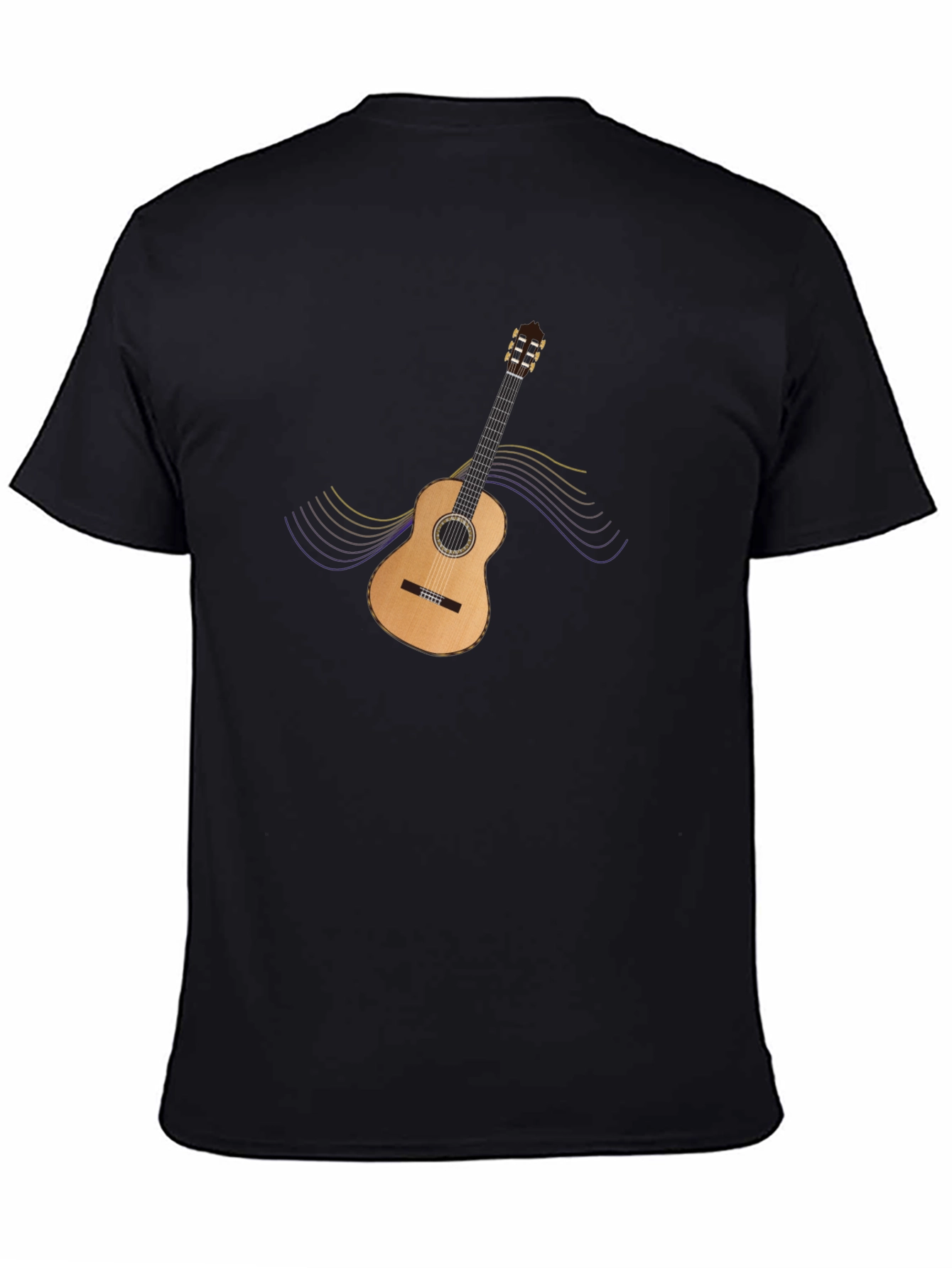 Show off your love for music with this stylish black t-shirt. Featuring a vibrant guitar graphic with sound wave accents, this tee is perfect for musicians and music enthusiasts alike. The design is eye-catching and unique, set against the classic black backdrop for a modern look. Made from a soft, comfortable fabric, this t-shirt ensures all-day wearability, whether you're jamming with friends, heading to a concert, or just expressing your passion for music. This is a must-have addition to any wardrobe.