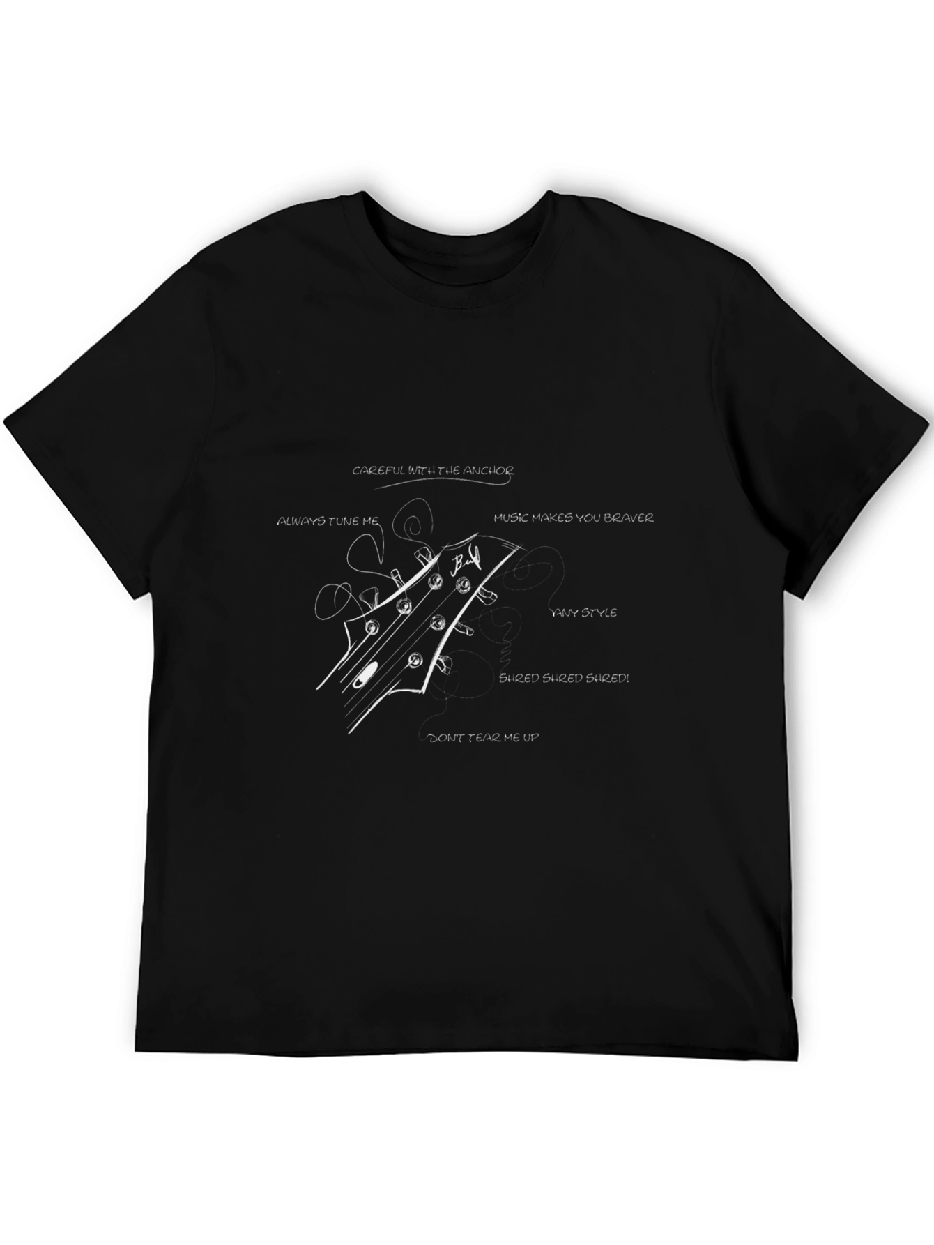 Show off your love for music with this unique guitar headstock t-shirt. This black tee features a detailed graphic of a guitar headstock with artistic script surrounding it. Made from comfortable, breathable fabric, it's perfect for everyday wear or for attending concerts and music events. The design is both eye-catching and stylish, making it a great conversation starter for musicians and music enthusiasts alike. Whether you're jamming with friends or simply expressing your passion, this t-shirt is a must-have addition to your wardrobe.